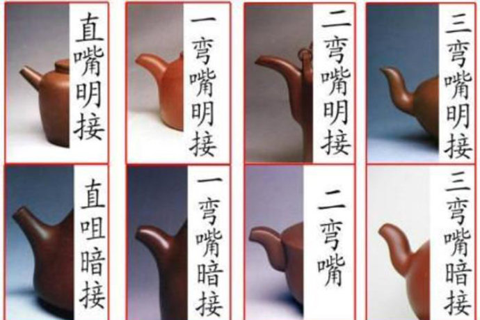 流形的鸭嘴:源于奶杯造型,一般用于茶器、咖啡具的造型上。 上述一弯嘴、二弯嘴、三、弯嘴式仅指其基本形,依附于壶体又可在壶嘴上分割筋纹,亦可加饰花塑器方法与壶把相统一。