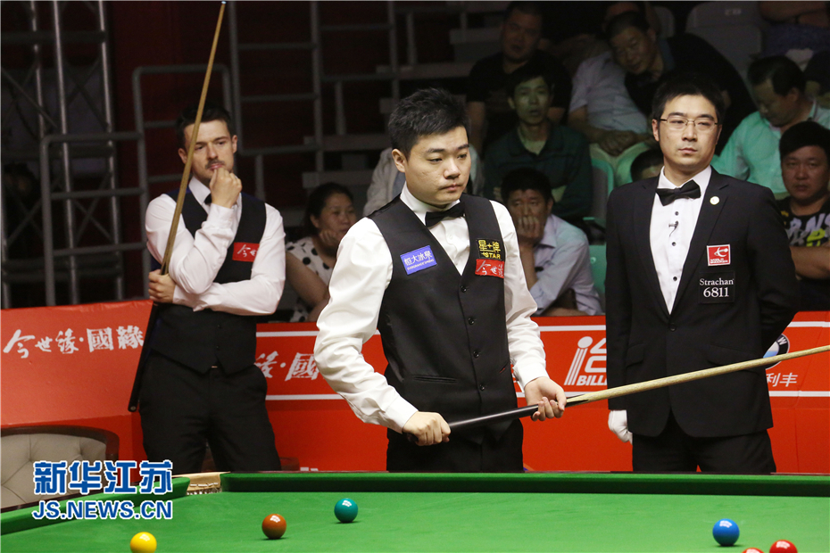 6月21日,中国选手丁俊晖(中)和英国选手迈克尔·霍尔特(左)在决赛中。(丁焕新摄)