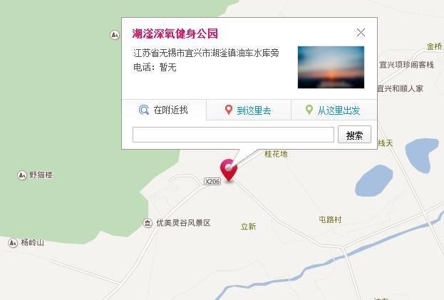 宜兴湖㳇深氧健身公园,神奇的湖㳇深氧界,2016年被评选为江苏省最美跑步路线之一。位于宜兴以南的湖㳇镇阳羡湖(油车水库)边,绕水而建,设跑道、自行车道等健身设施,有阳羡湖、香梅桥、茶园等景观,路段两侧有绮丽的阳羡湖、绵延的茶海、茂密的竹林构成的"翡翠长廊"。这里拥有最让湖㳇人骄傲的清净空气,有大自然赋予的"深氧"之称,园内每立方厘米10万个负氧离子,是大城市负氧离子含量的10到15倍,被称为"华东第一天然大氧吧",更是喜爱户外运动的人们最好的健身之地。