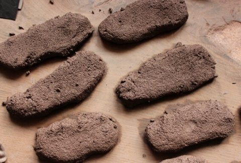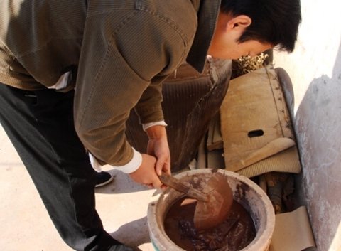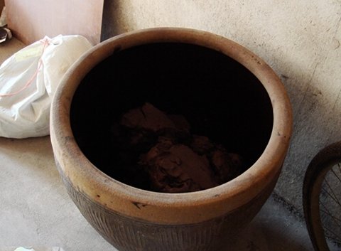 七、邢洪林把吸收了一些水分的泥用木锤拍打成块,放入缸里,密封一段时间
