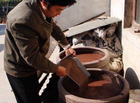 a、紫砂泥的炼制,基本上分成手工和机械加工两种。紫砂矿石挖出后,放在露天里,让其自然风化成颗粒,后用石磨碾细再陈腐备用。手工炼制泥比较费时费力。应用手工制备的熟泥,经手工成壶,烧成后,由于泥团粗细悬殊,烧成时体积收缩不一,外表粗颗粒略有凸出,又富有滋润光泽的质感。而疏松的内壁因泥料矿物组成和团粒堆积等因素而形成的空隙,具有一定的气孔率和吸水率。吸水率达3~5%,透气好。机械炼制的紫砂泥,泥多砂少,经过真空后,泥质紧密,用肉眼观察,少有气孔。用机器练制的熟泥,尽管手工成型,烧成条件不变,但其表面已失去梨皮状的紫砂特有效果,制品的吸水率从通常的3~5%下降到目前的 1%左右。有些细腻的就吸水率就更差,1%都达不到。
