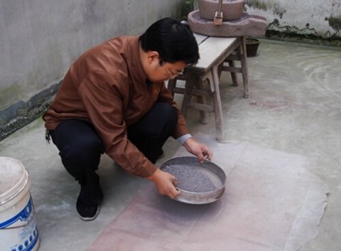 四、邢洪林把磨细的紫砂泥用60目或40目的筛子把大颗粒筛选掉