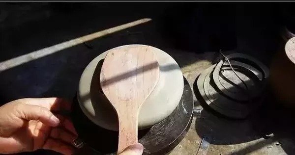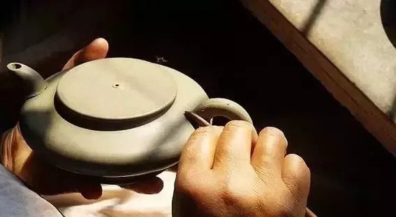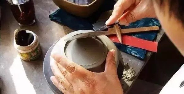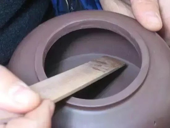 紫砂壶成型过程中,壶内壁出现凹凸不平时,为了使表面光滑平整,艺人们使用工具去进行整理,这就是"推墙刮底"。