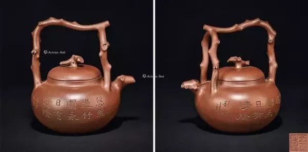 此壶乃曼生喜极而制,故此壶风格绮丽,所谓雾余水畔,红杏在林,典美精工,余味无穷。此壶极富天趣,取皆大欢喜之意。