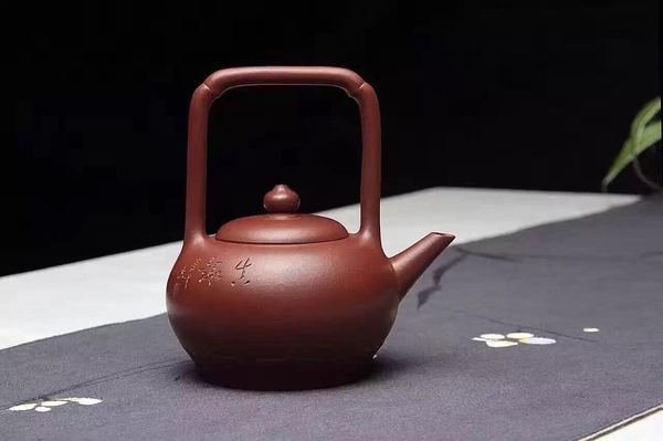 提梁壶,小口,细流,鼓腹,平底,有盖,为了提拿方便,在肩部两端连以半月形提梁。提梁为紫砂器传统式样。分素式和花式两种,素式提梁通常用于光器,花式提梁常见用于仿真器(花器)。提梁之形状,相传是从瓦炊、青铜壶提梁等造型借鉴而来。提梁壶可分硬提梁与软提梁,由于壶体与提梁,虚实对比分明,造型优美,别具情趣。