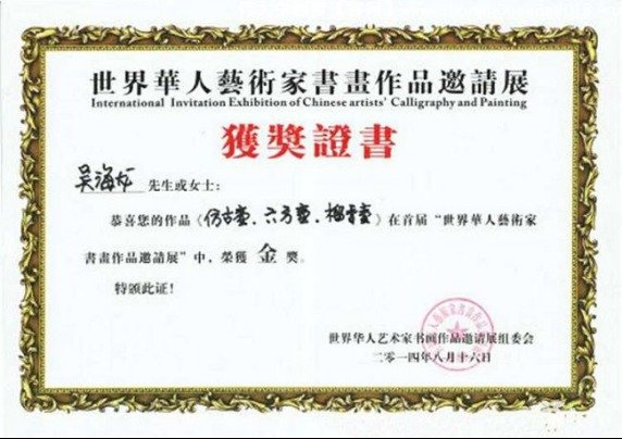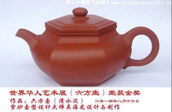 2014年8月16日,吴海龙大师仿古壶、六方壶、榴香壶作品在首届世界华人艺术家书画作品邀请展中荣获金奖。