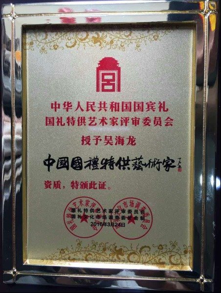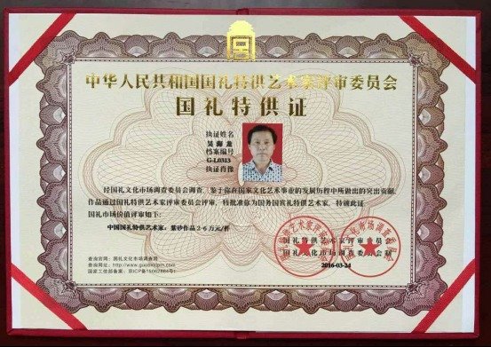 2016年3月24日,经国礼特供艺术委员会和国礼文化市场委员会评审授予《中国国礼特供艺术家》称号和《国礼特供证书》。