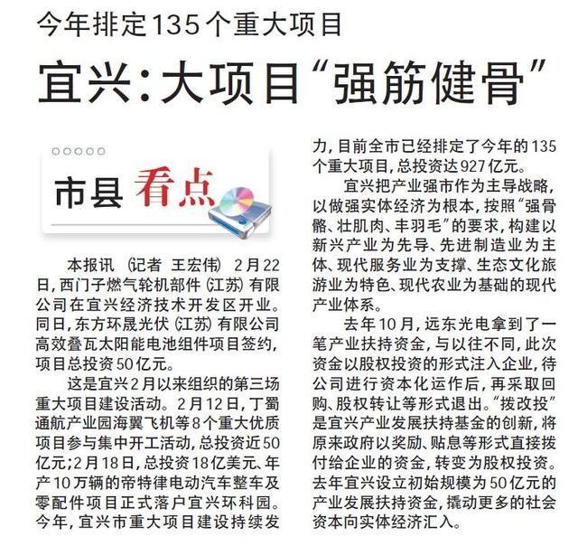 要让大项目、好项目落户宜兴,除了企业的选择外,与市委政府顺应发展潮流,迅速抓住机遇也是离不开的。一方面,我市明确项目建设是地方经济发展的"牛鼻子"这一事实,坚定全市上下加快发展的信心决心,造浓齐心协力抓项目、强产业的良好氛围;另一方面,我市围绕提升服务效能,加强政策服务,优化审批服务,深化暖企服务。"抓产业"与"精服务",发挥出了1+1大于2的效果。