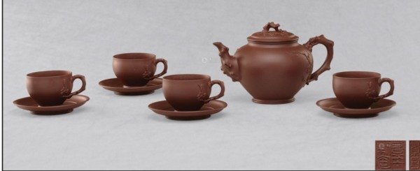 4.九件组巨作 顾景舟的作品主要以单壶创作为主,连杯的套组较为少见,此套"咏梅茶具"多达九头之多(一壶、四杯、四托),弥足珍贵。顾氏极为重视传统纯手工制壶技艺,从手工捶泥到排窑送烧,一砂一泥、一杯一托,亲力亲为,毫不取巧,当年锐意创新的顾景舟对此套九头茶具所耗费的心力与时间,想必殊为可观,也更甚于其他作品。