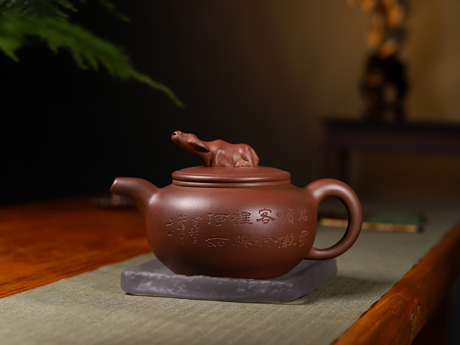 他的“牛盖洋桶壶”,紫褐色,外观光润可人。这是件传统造型,但他做得不俗,整体端正稳健,朴实规矩,有股挺拔气势,壶身的圆范、流、肩和盖的弧线过渡都十分流畅,洋溢着一种韵律。此壶为任淦庭陶刻,可谓珠联合。