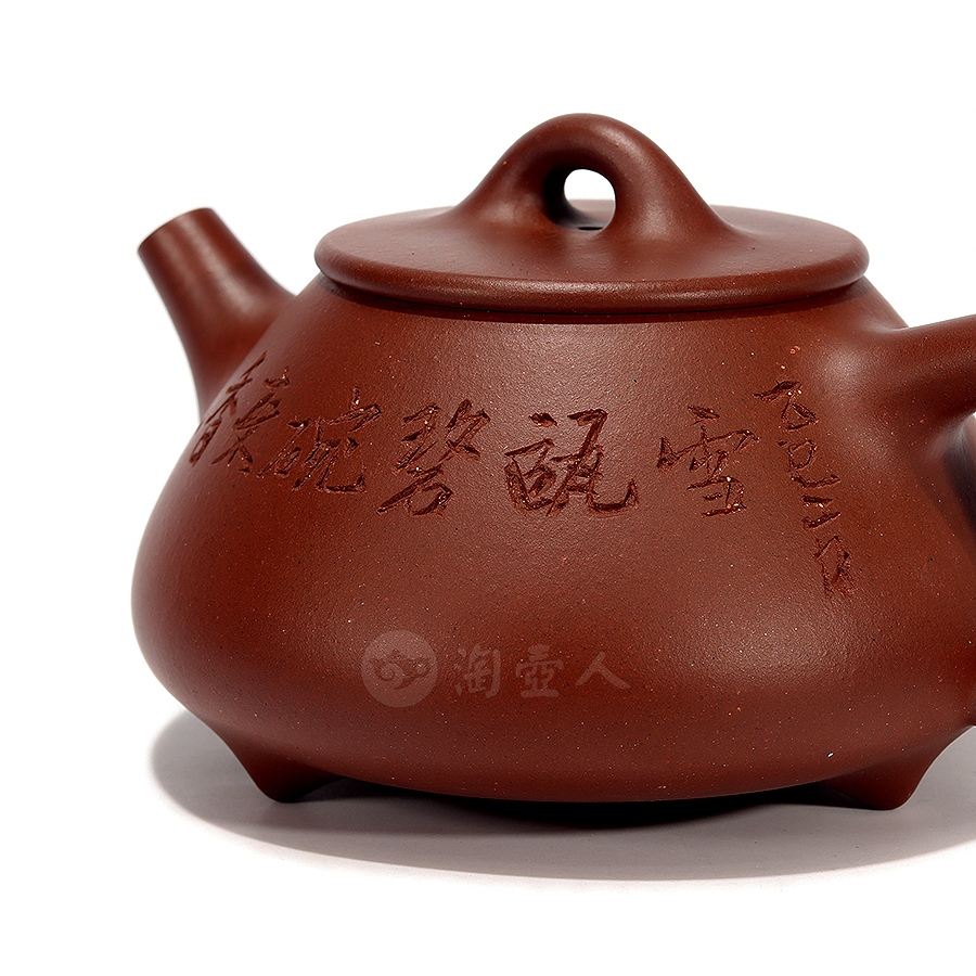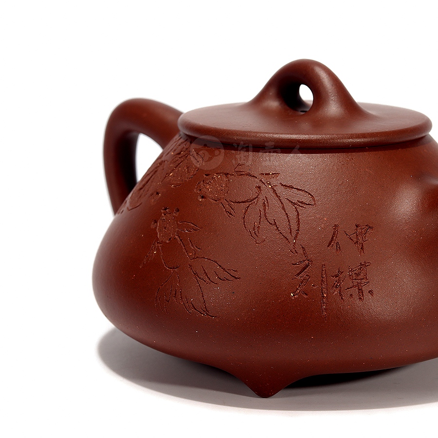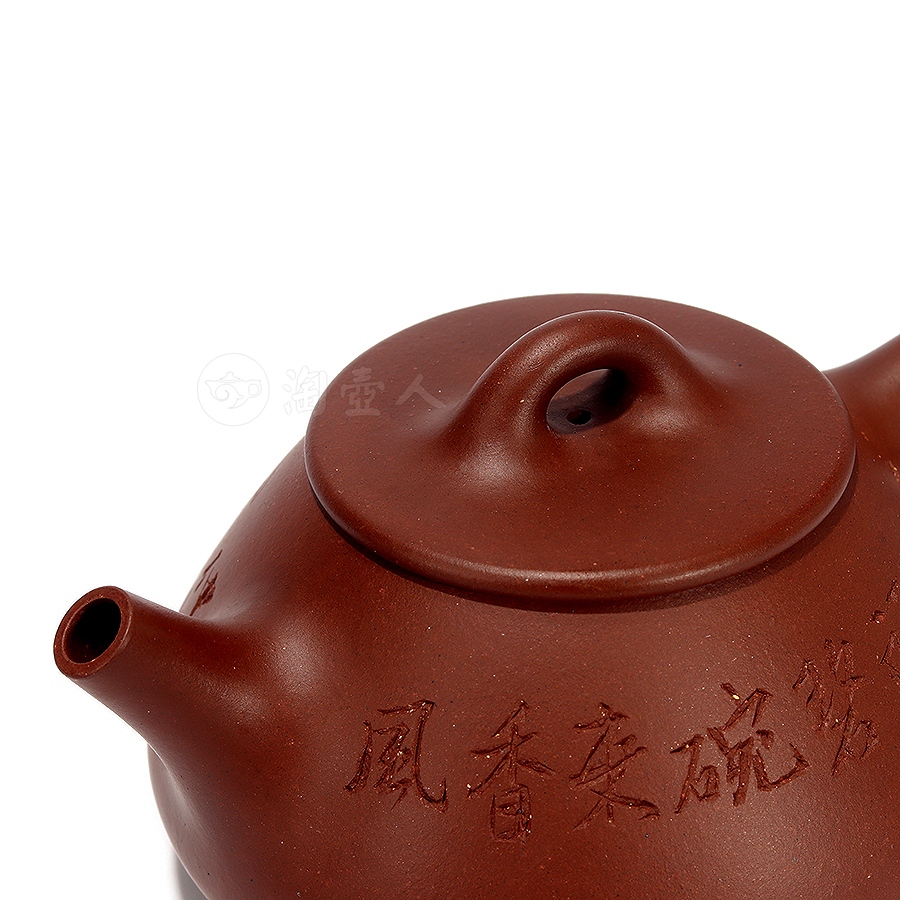 壶身由鲍仲梅大师陶刻装饰,正面镌刻“雪瓯碧碗来香风”,落款“乙巳二月”,反面刻绘荷塘景色,两只金鱼遨游于荷叶间,刀法洗练处尽显文人画意。整壶质感细腻而温润,形体精致而优雅,陶刻细腻而具文人风范,是为可赏可玩可用的一件品茗佳器。