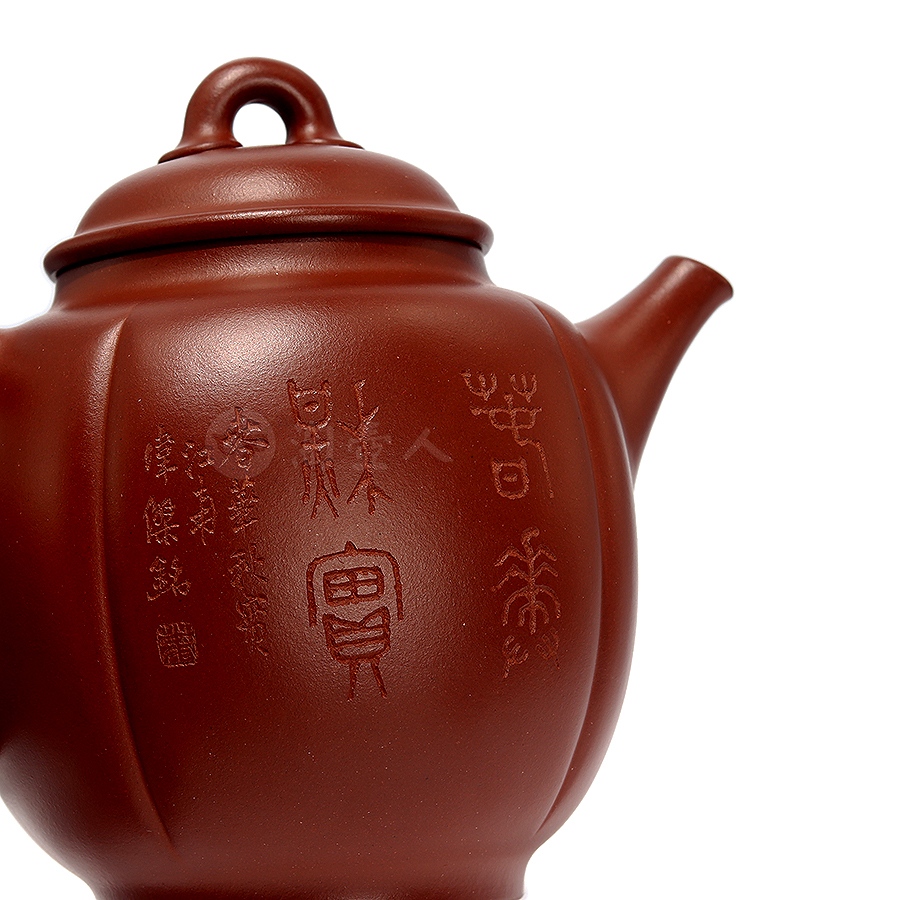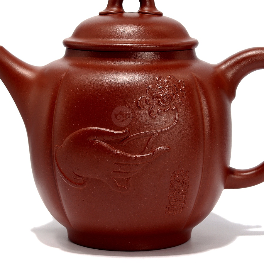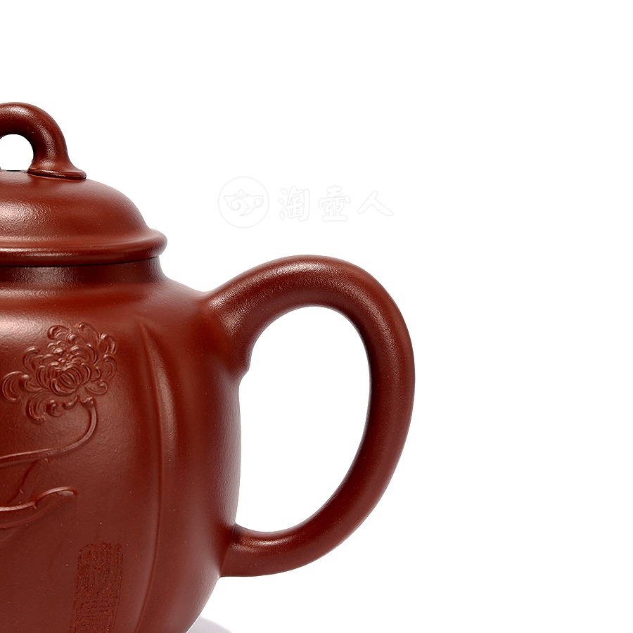 壶身正面泥绘持菊佛手,佛手轻拢,指尖微翘,菊瓣舒展,只以素泥勾勒,境界清雅脱俗,反面则由陶刻名家蒋伟杰挥刀作铭,篆体“春华秋实”四字端凝古朴,笔锋间藏着岁月的沉潜,旁落“春华秋实 江南伟杰刻”,似禅者题跋,不事张扬却自有风骨。