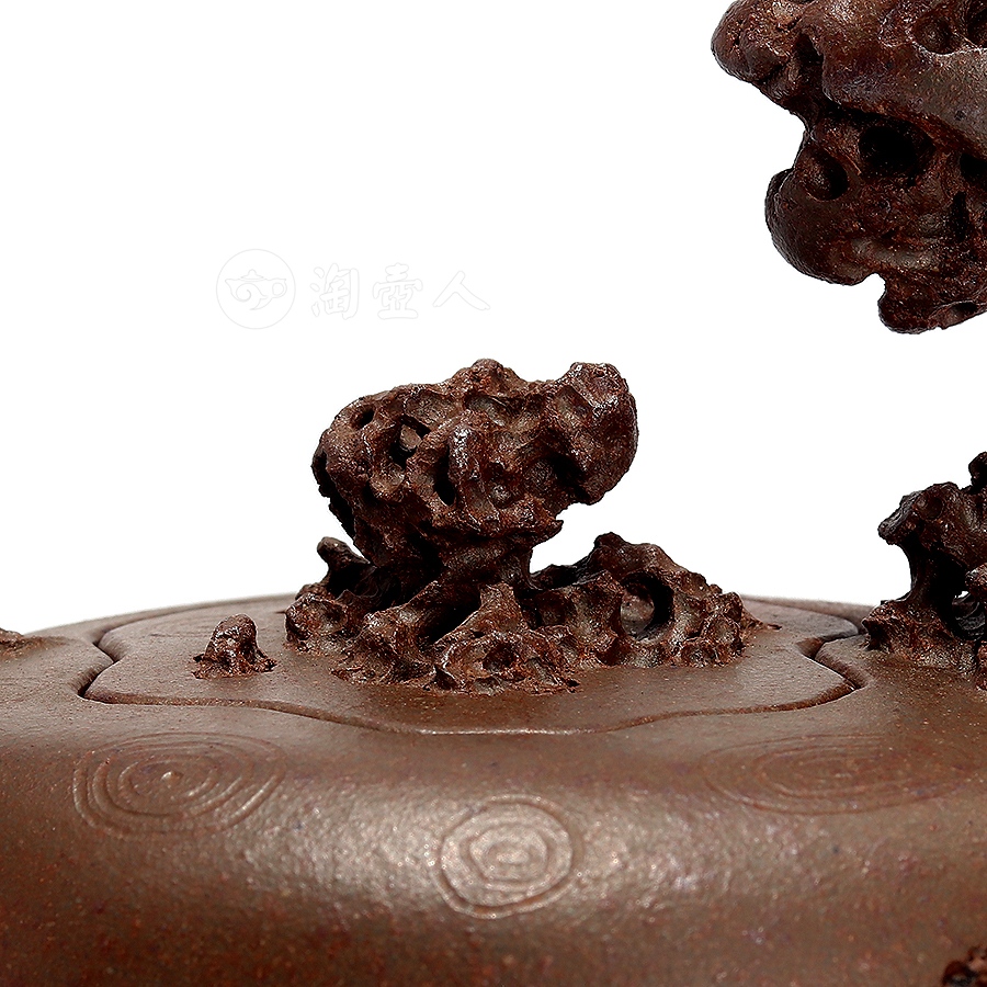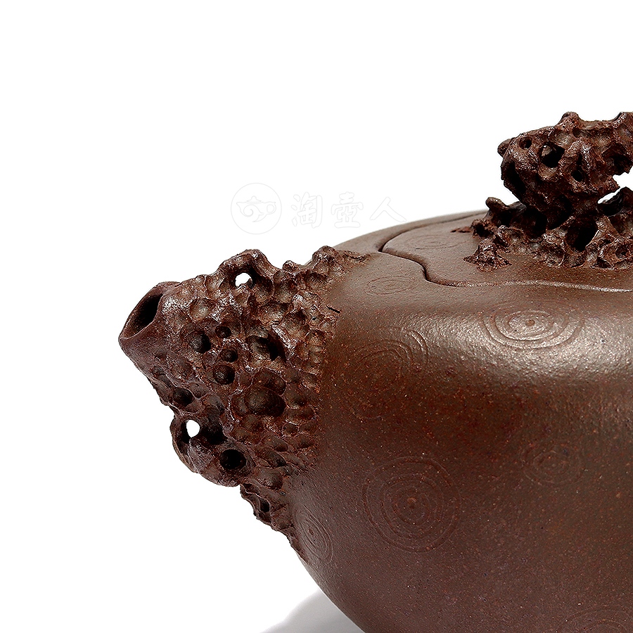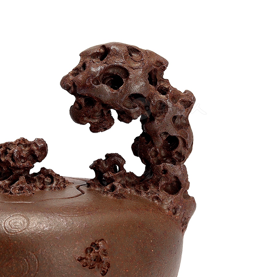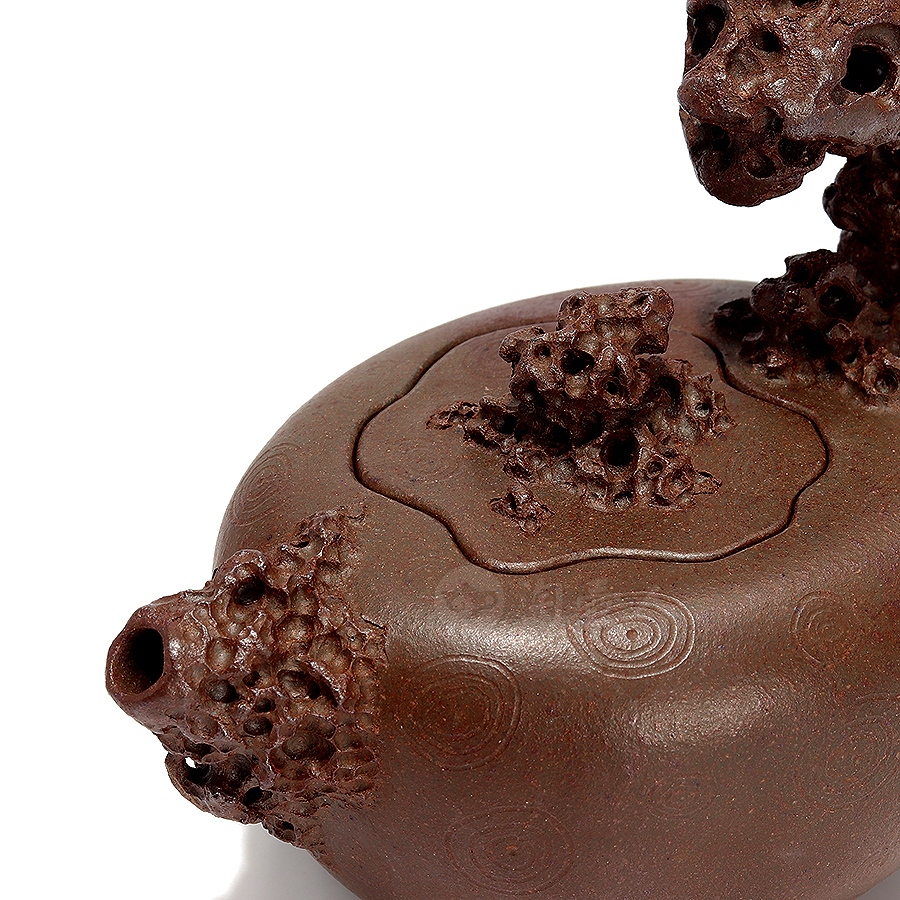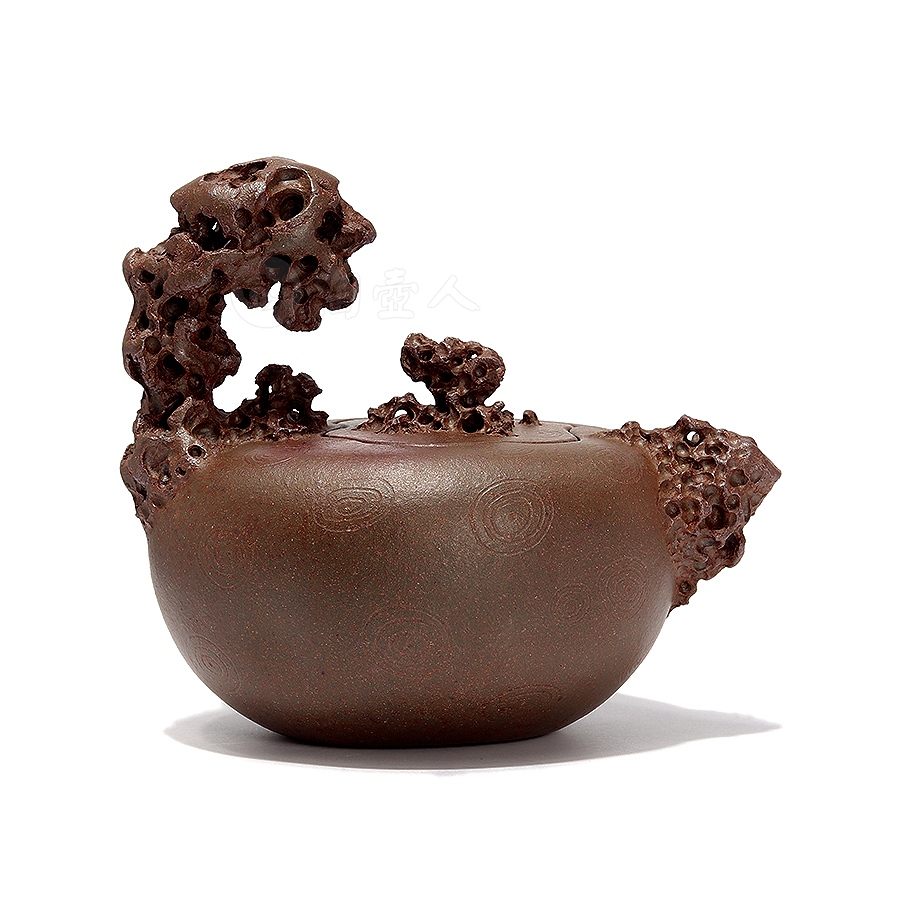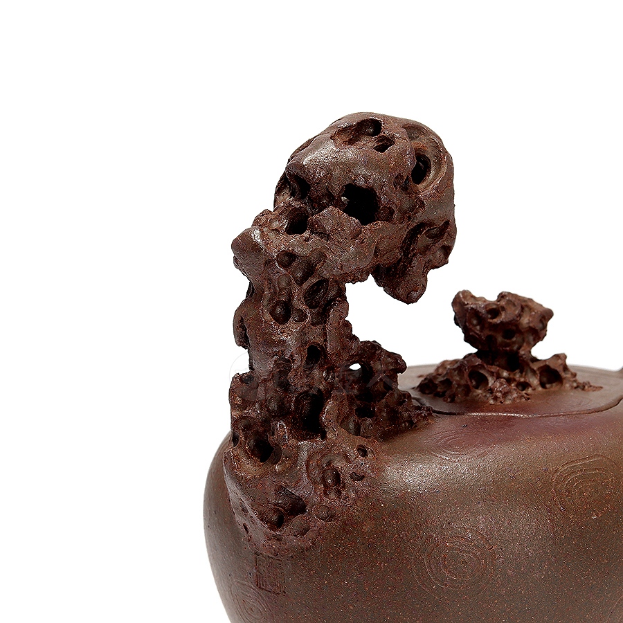 嵌盖内陷于壶口,严丝合缝,浑如一体,流、把、钮皆雕琢成镂空奇石形态,各部件造型各异却风格统一,纹理雕琢得灵动逼真,与“石语”主题绝妙契合。整器突破传统花器形制,造型新颖,工艺精妙,足见厉振宇对花器创作的独到理解与塑造能力,无愧其“花器鬼才”之称。