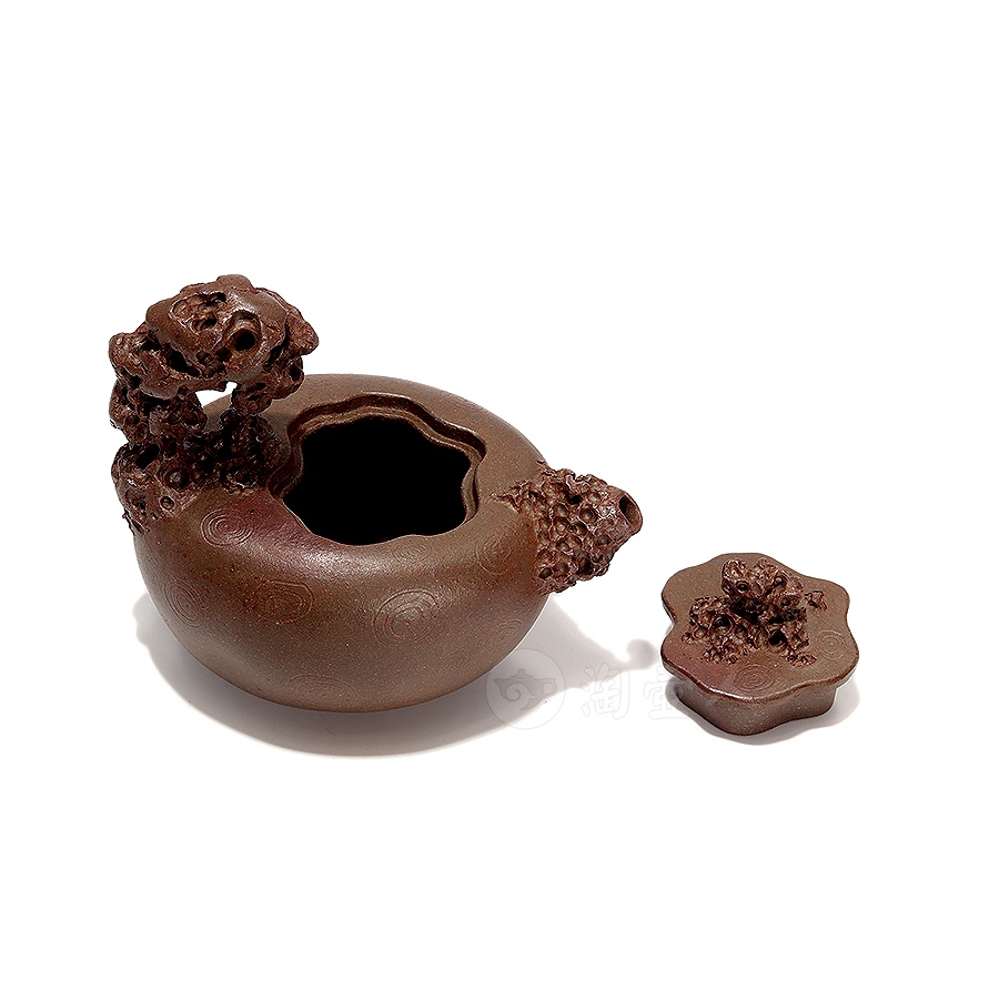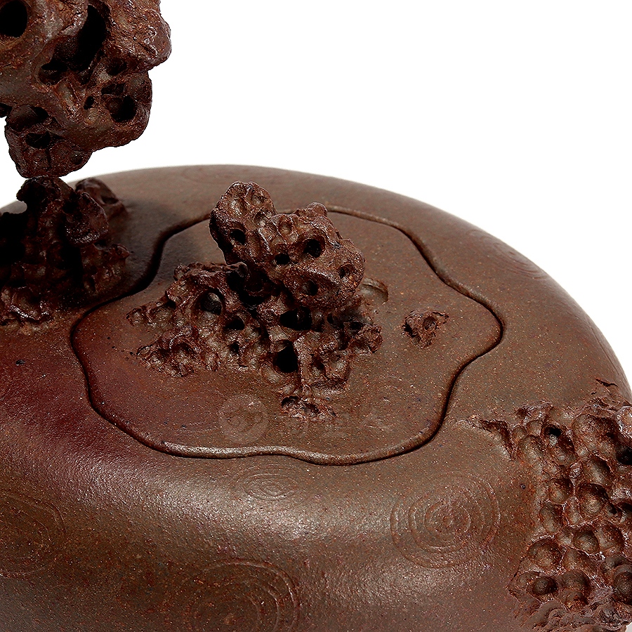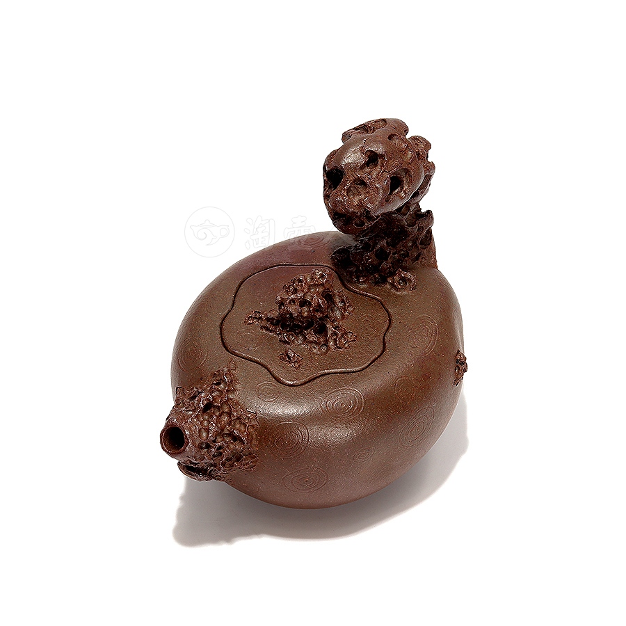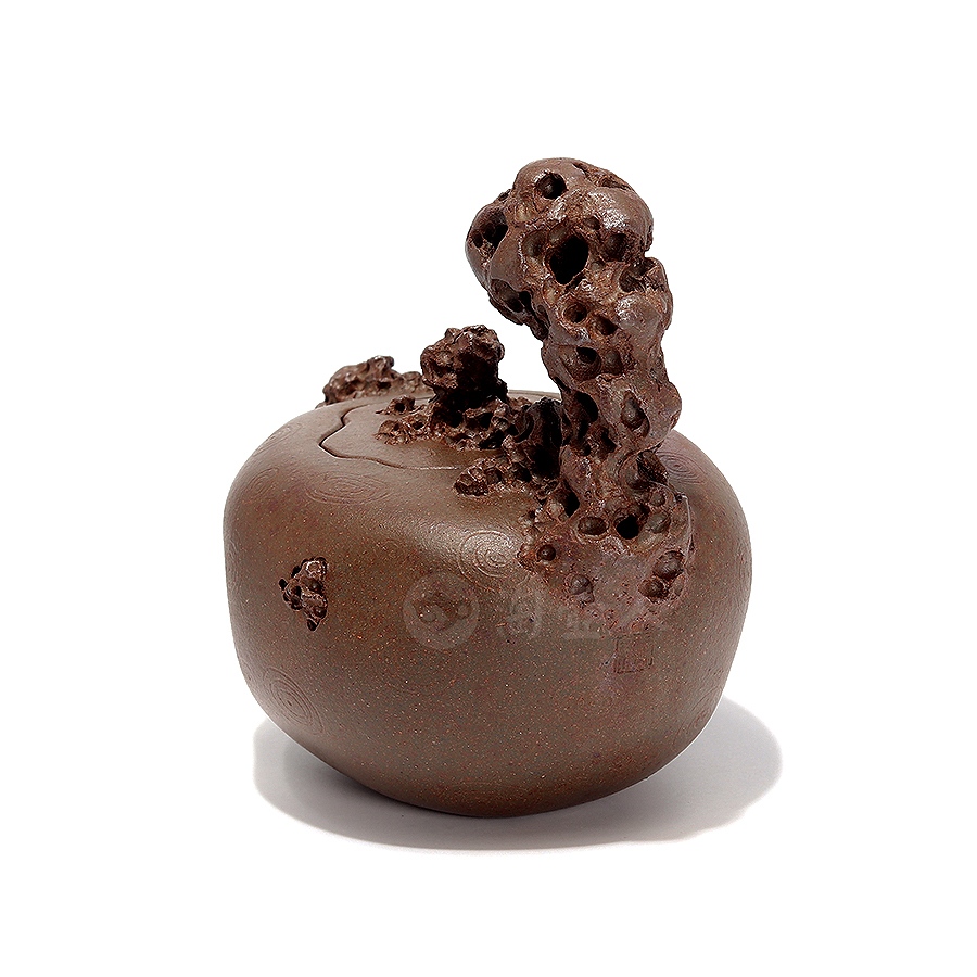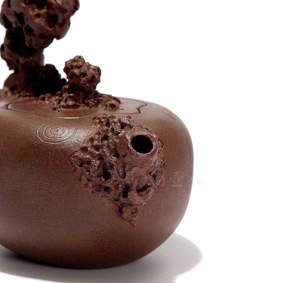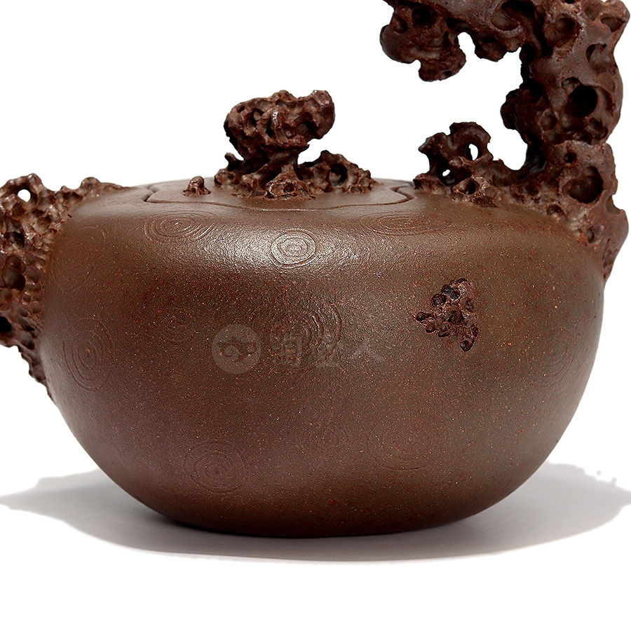 嵌盖内陷于壶口,严丝合缝,浑如一体,流、把、钮皆雕琢成镂空奇石形态,各部件造型各异却风格统一,纹理雕琢得灵动逼真,与“石语”主题绝妙契合。整器突破传统花器形制,造型新颖,工艺精妙,足见厉振宇对花器创作的独到理解与塑造能力,无愧其“花器鬼才”之称。