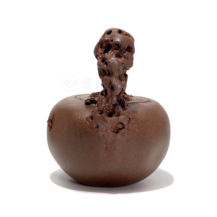 此件石语壶,为作者原创设计,选用原矿老段泥全手工精制,身筒扁圆,上丰下敛.