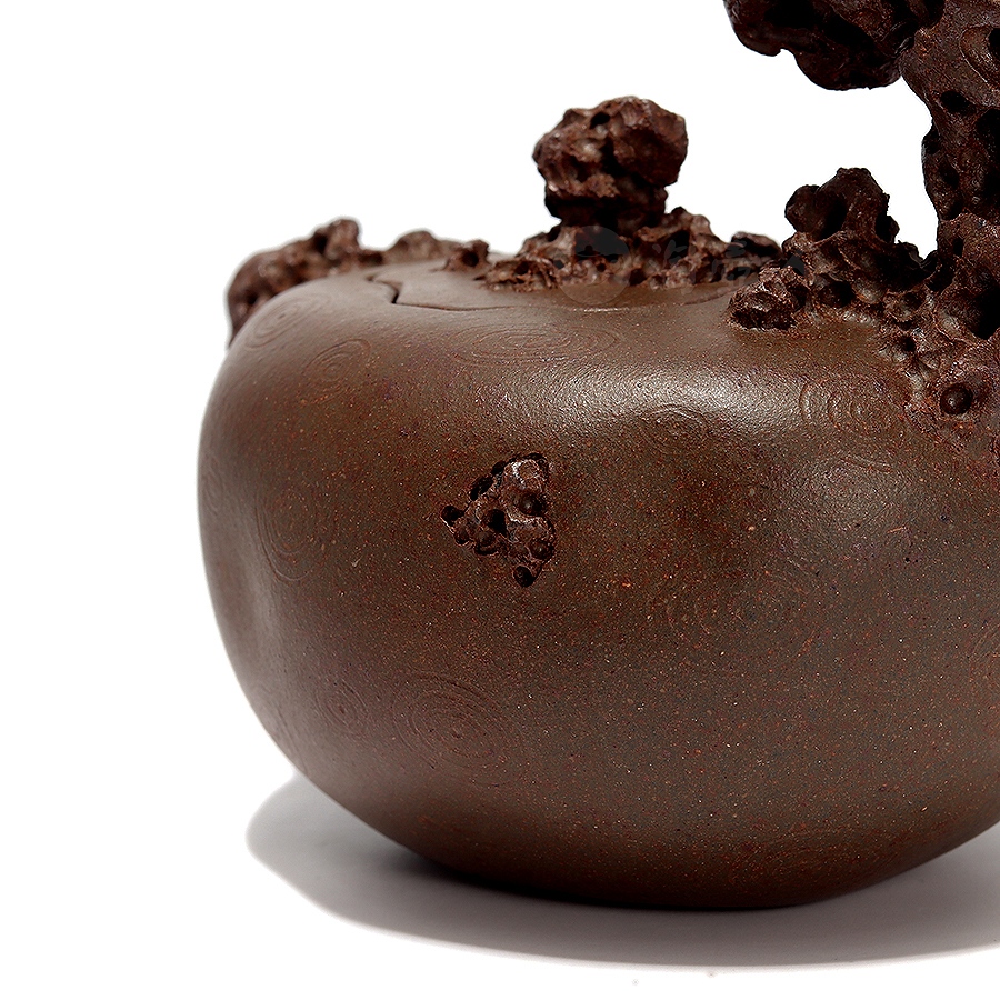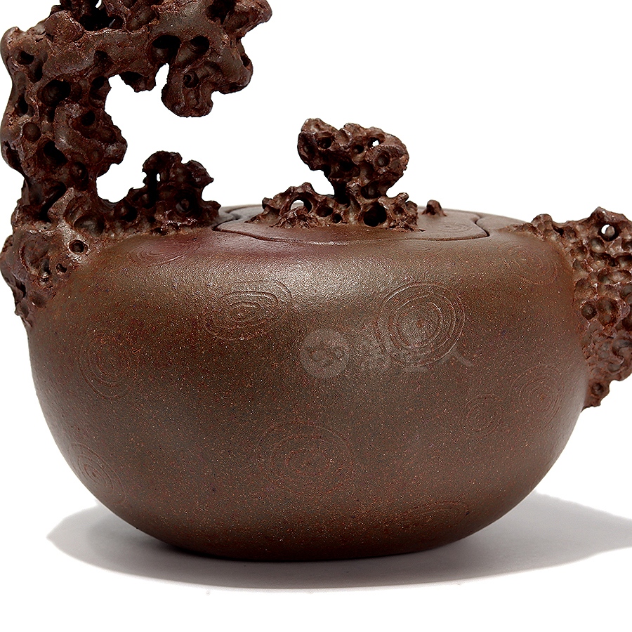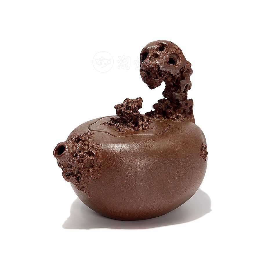 此件石语壶,为作者原创设计,选用原矿老段泥全手工精制,身筒扁圆,上丰下敛,流、把、钮皆雕琢成镂空奇石形态,各部件造型各异却风格统一。