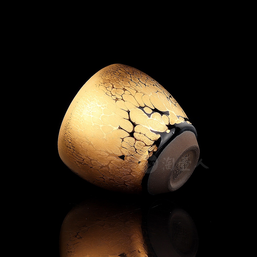 金油滴盏的斑纹在光线映照下如繁星闪烁,金色斑点与黑色釉面形成强烈的视觉冲击,兼具金属质感与陶瓷的温润质感。这种独特的釉色效果不仅具有观赏性,更承载了宋代文人对自然之美与禅意的追求,是传统陶瓷艺术与现代工艺结合的典范。