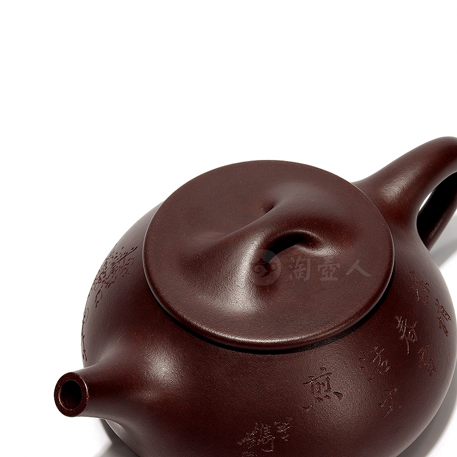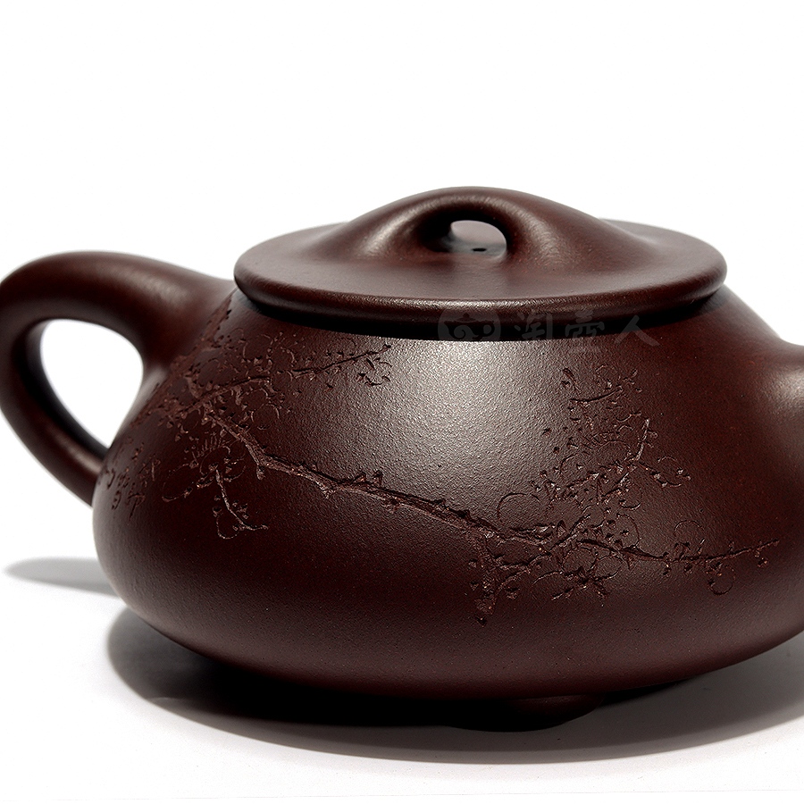 壶身陶刻出自吴东元之手,正面刻“梅梢春雪活火煎”,反面刻绘墨梅,疏影横斜,暗香浮动,文人气息浓厚,极具观赏性。