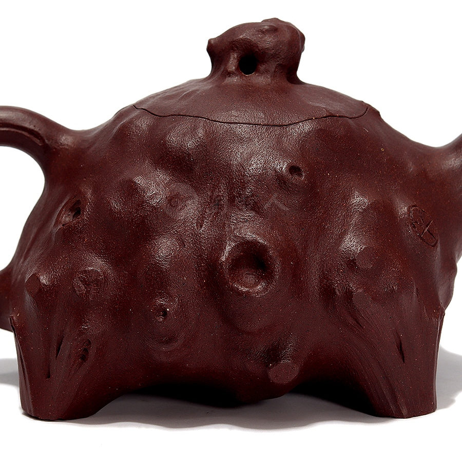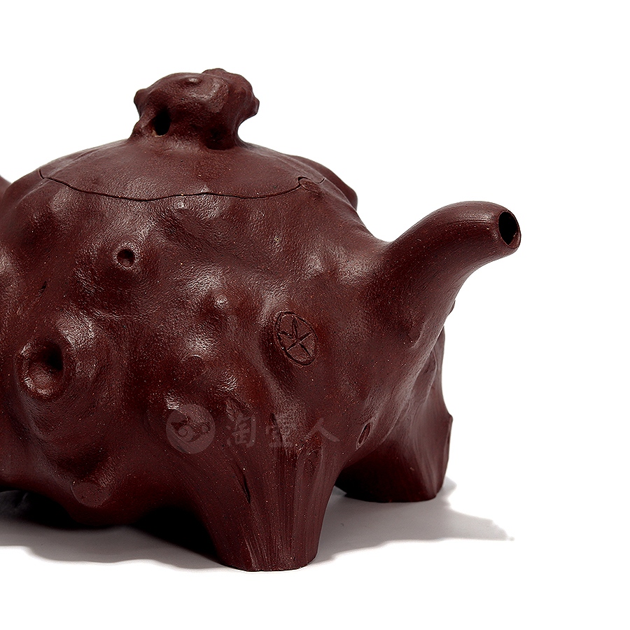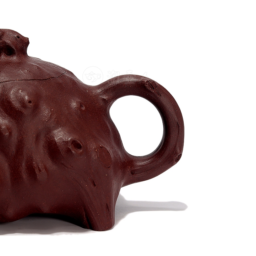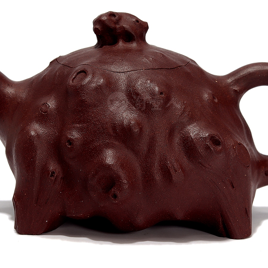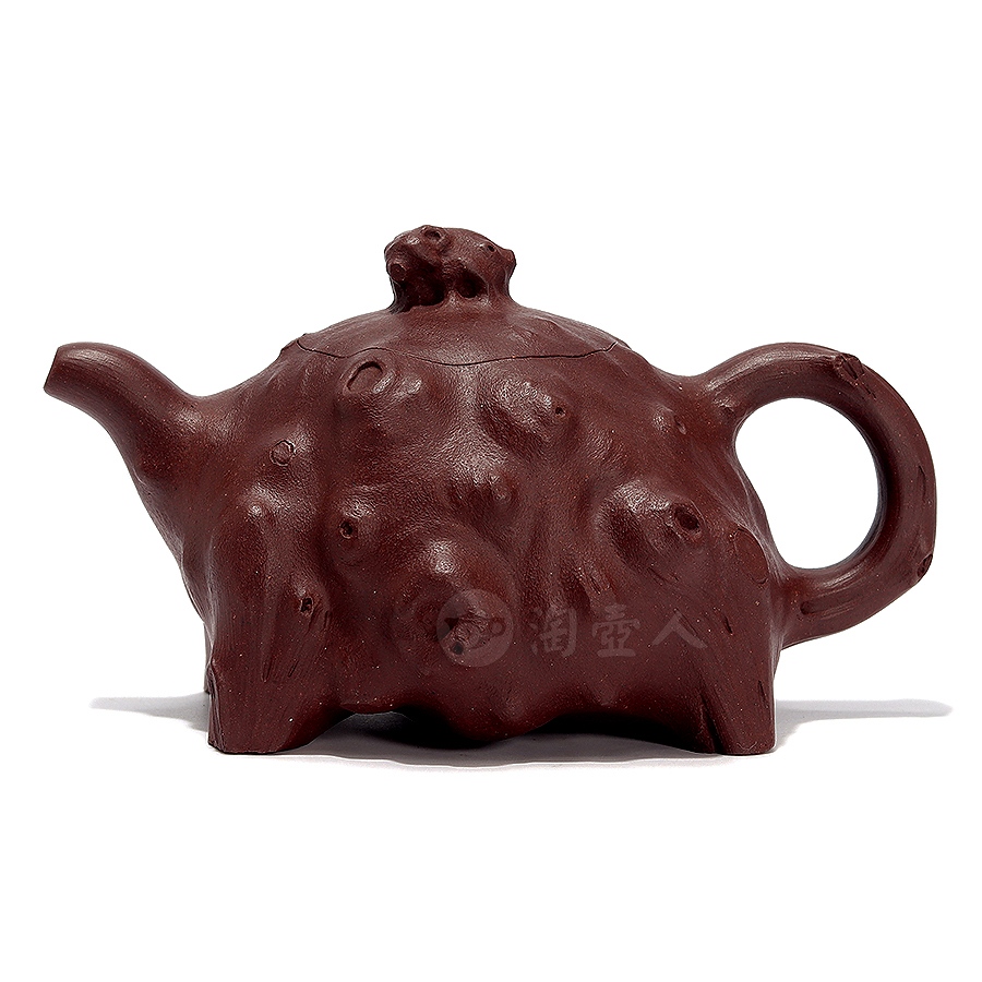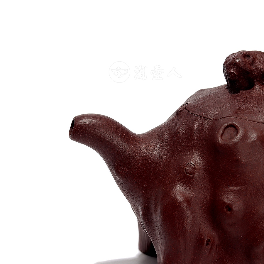壶的造型模仿“树瘿”,泥色沉稳内敛,仿佛一件历经岁月洗礼的老木器物,充满了古朴沧桑的质感。
