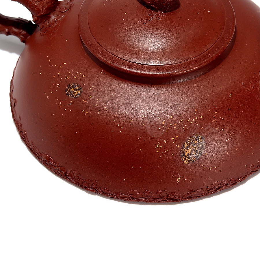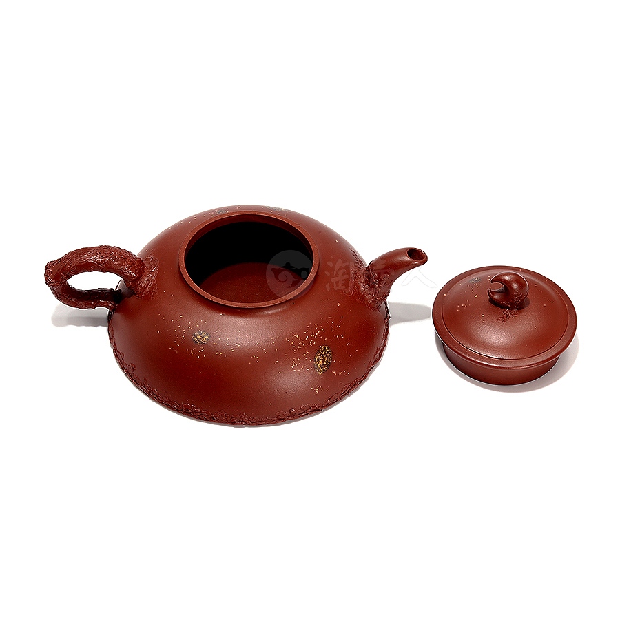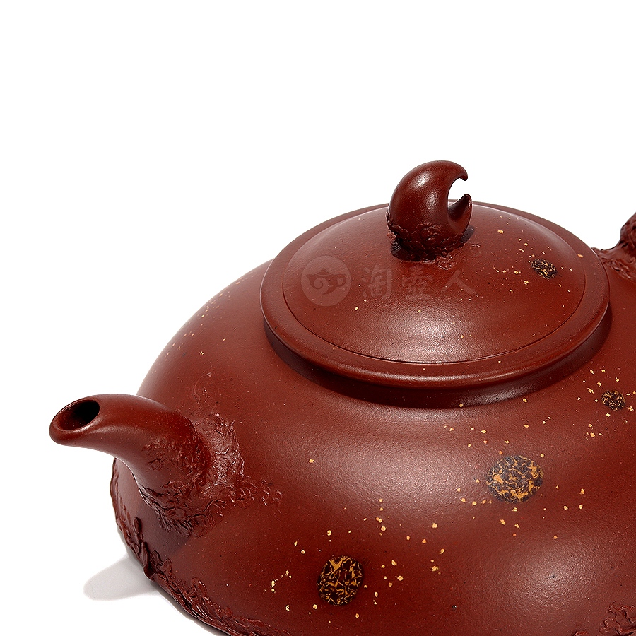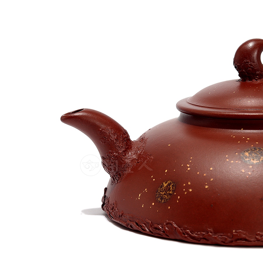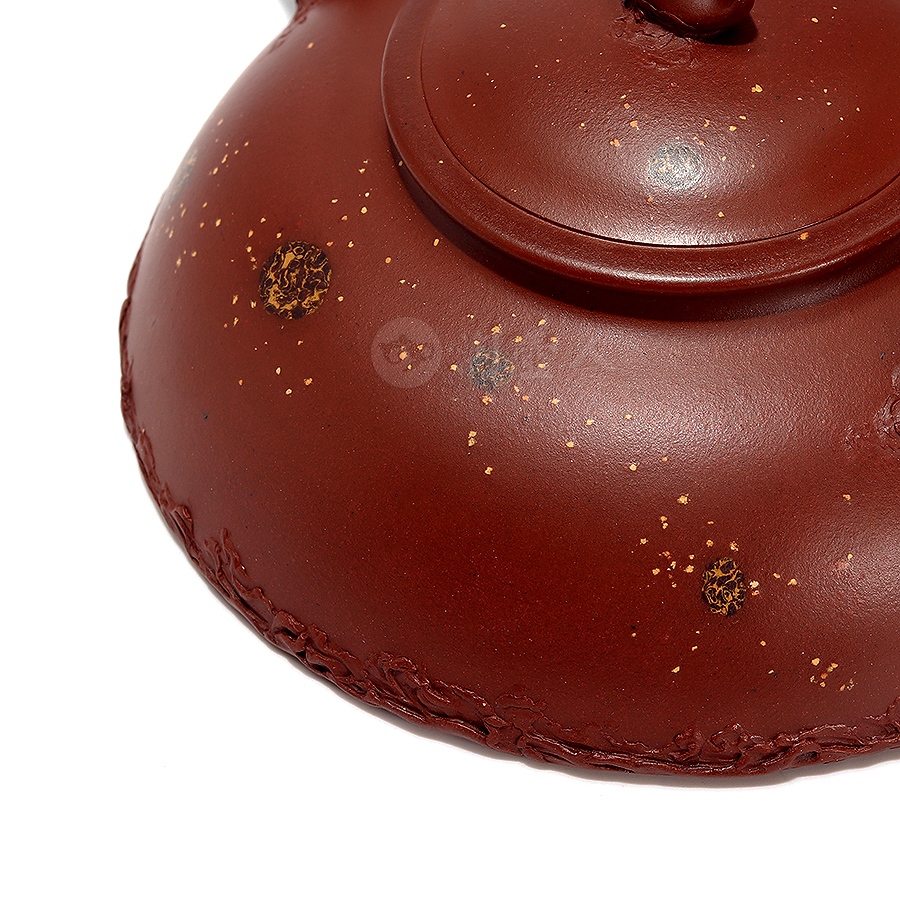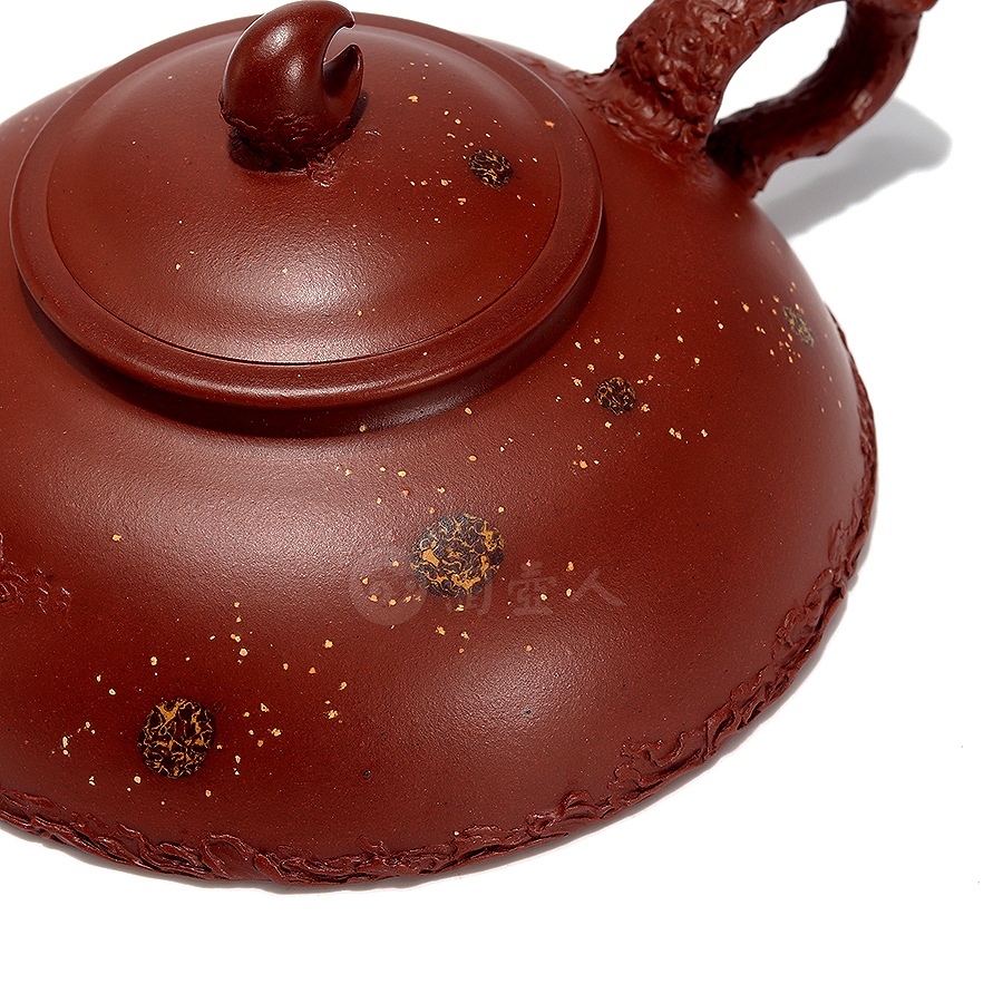余伟辉此件星辰大海壶,为作者原创代表作,甄选家藏黄龙山原矿红皮龙泥料,以薄胎工艺成型,更融入其钻研 8 年的绞泥漆皮技法,在 1.5 毫米薄胎壶身嵌入绞泥漆皮再施明针,此手法目前紫砂行业无人能做,堪称第一人。高温窑炼后,壶体质坚,砂粒隐现间泛着温润玉光,经数次冲泡便现迷人包浆。