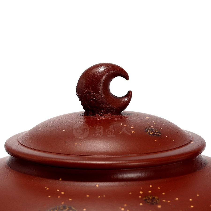 壶形上敛下丰近半月,极扁造型易塌陷,此壶却弧度饱满有力,气韵充沛。壶身塑出湖泽与星空交织之景:下部以堆泥技法塑就翻滚的海浪,上半部分以绞泥漆皮与点砂工艺共塑星空异象,主星辰依次排布,砂砾仅缀主要星系周边,细腻还原星空的深邃神秘,视觉上尽显宇宙辽阔。壶钮塑小巧肉实的月亮形,似明月悬于湖泽,自然衔接水与天,流和把的装饰纹理如云层,与星空意象呼应,让壶之湖泽星空意境浑然一体。
