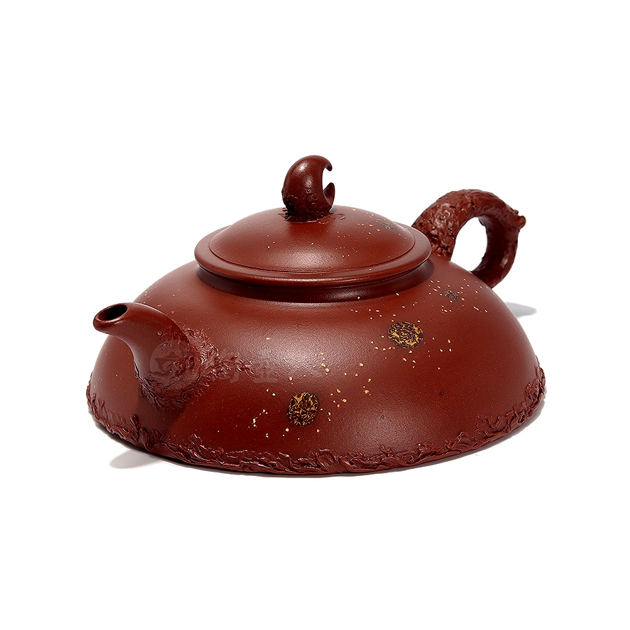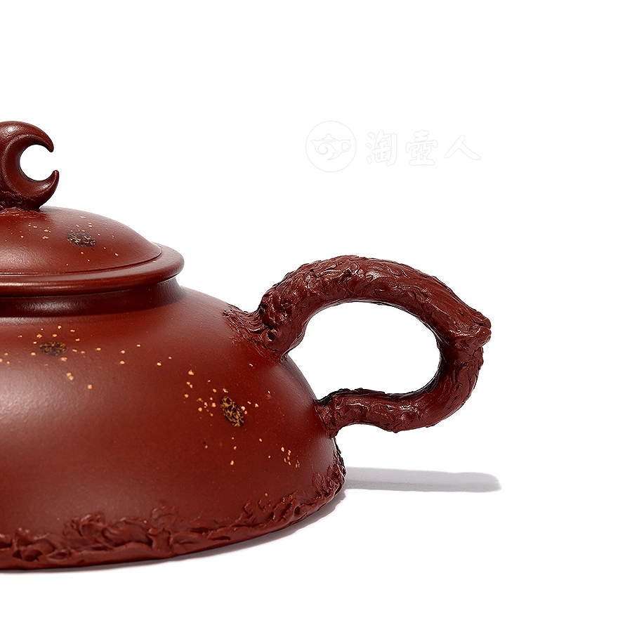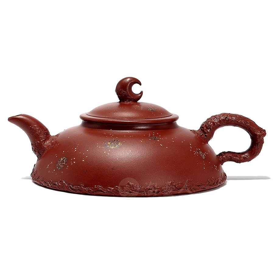 执把设计突破紫砂耳型、方型等固有框架,前后协调,即便壶身下方比例大、占满视角,流把也不显单薄,由中往前后两端舒展打开,完美贴合壶身,与上方星空辽远感相得益彰,足见匠人深厚设计功底。此作超越了普通茶器的实用范畴,将天文意境、紫砂工艺与匠人精神熔于一炉,从泥料甄选到造型设计,从传统技法的突破到独创工艺的呈现,无不浸润着作者对紫砂艺术的深刻理解与炽热情怀,实谓值得细细品味的艺术珍品。