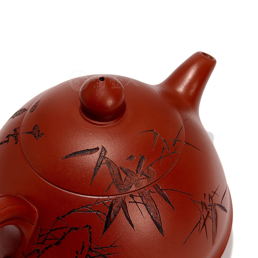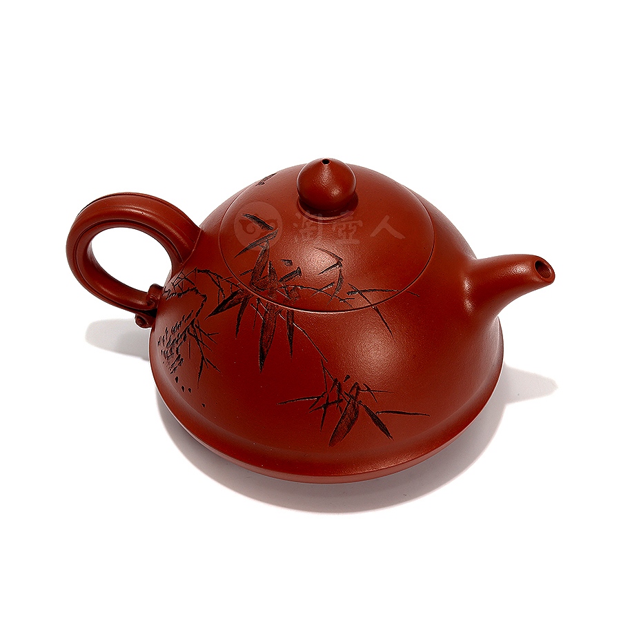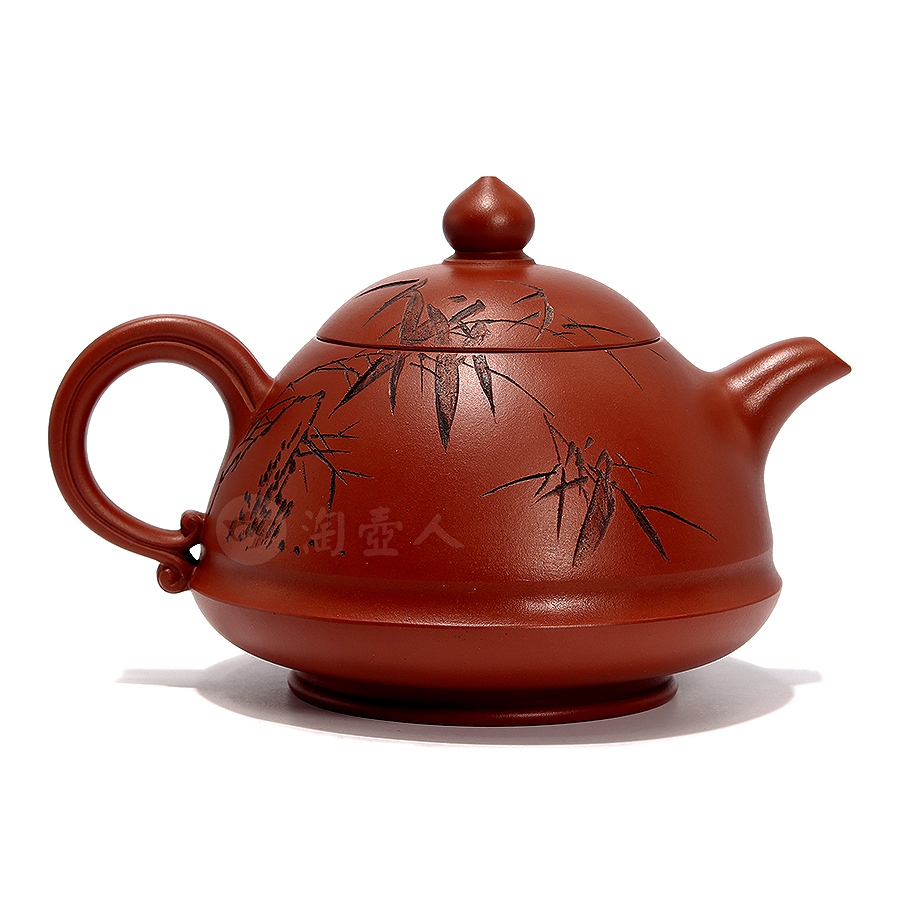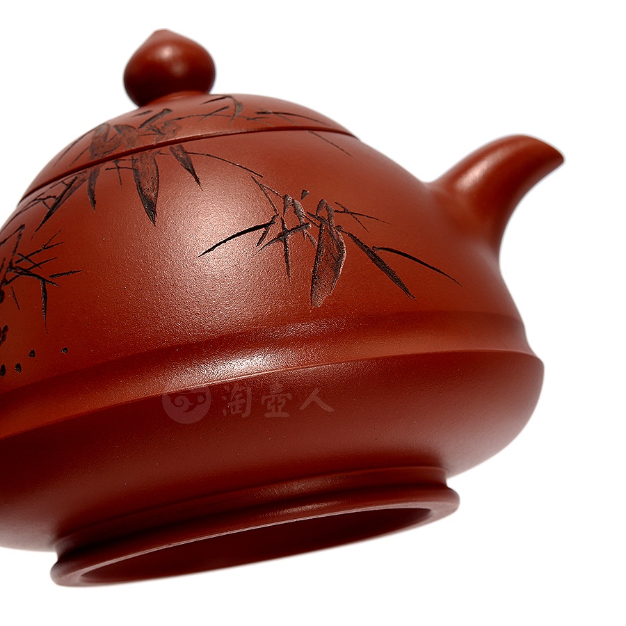 壶身陶刻出自谭泉海大师之手,正面镌刻“清心”二字,笔力遒劲,风骨凛然,落款“石泉铁笔”,反面刻绘破土而出的新竹,竹枝挺拔,竹叶舒展,寥寥数笔便勾勒出竹子的清隽风骨与蓬勃生机,尤为精妙的是,字与画皆跨盖、身相接,盖合时笔墨连贯无间。整器集材质之优、工艺之巧、意境之雅于一身,把玩之间,可赏其形、品其韵、悟其道,力荐藏用。
