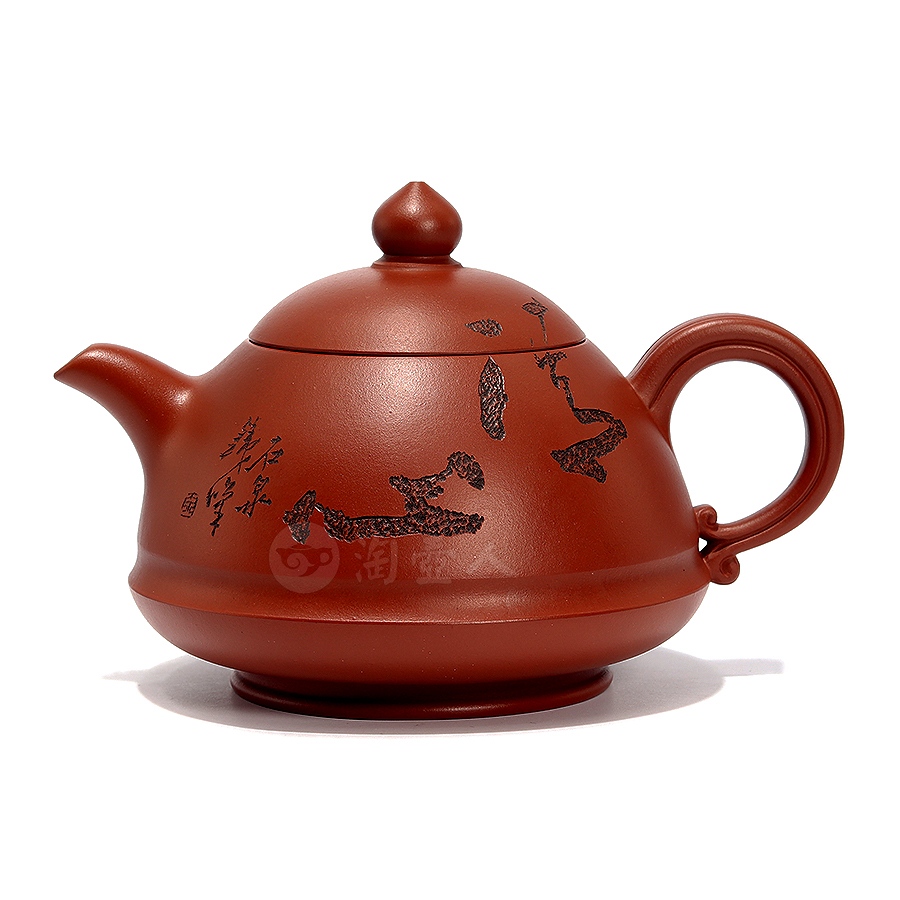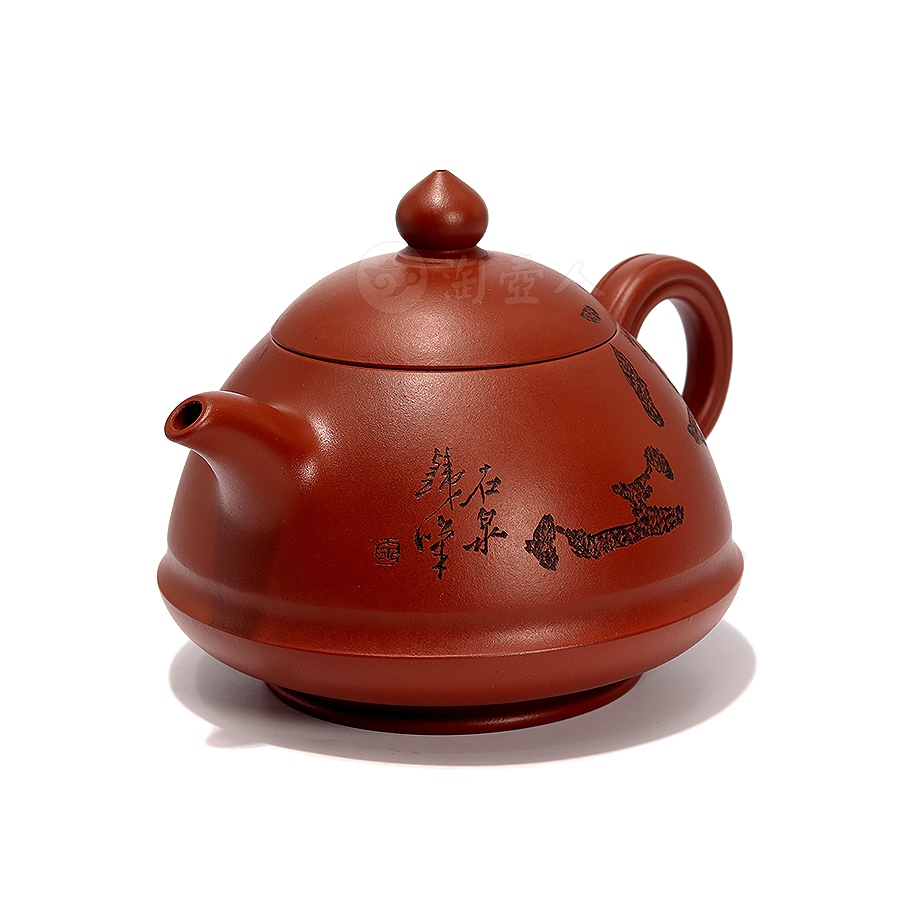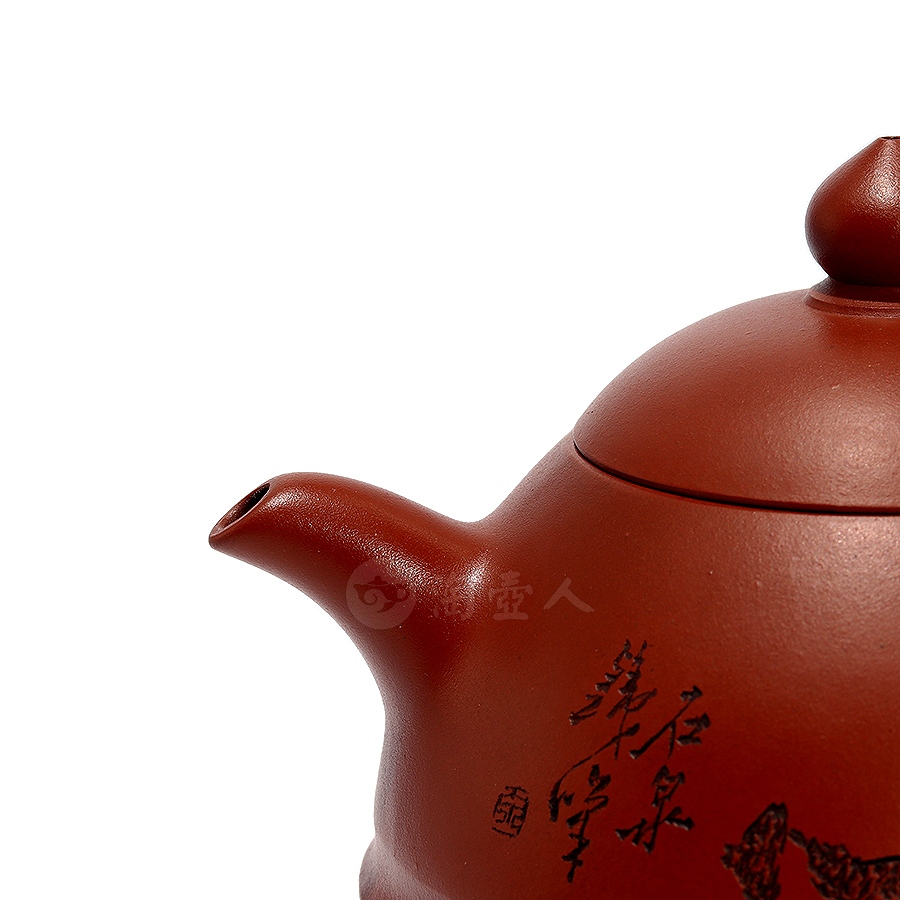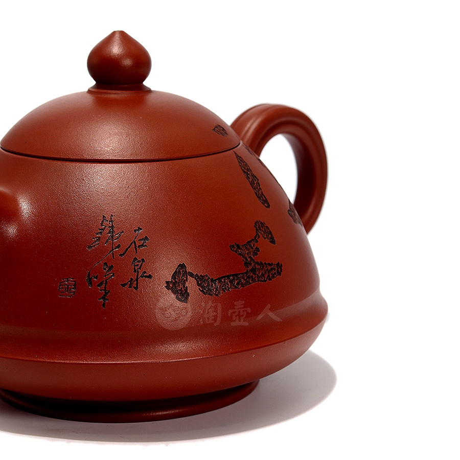 此件玉笠壶,为作者与国大师谭泉海合作于90年代,历经岁月流转仍品相完好,采原一厂小红泥制作而成,壶身取敦厚之姿,线条圆转有力,于沉稳中透着灵动,自盖顶起,流畅弧线顺势铺展,宛若雨天撑开的斗笠,舒展自然,下腹巧妙勾勒一圈凹线,在视觉上起到提拉之效,令整体造型更显轻灵俊逸,截盖与壶口对接工整,壶钮形制恰如壶体的微缩版,相映成趣,壶嘴弯曲有度,微微下倾,宛若渔翁垂钓时的悠然姿态,与如意形壶把一俯一仰、对立相生。