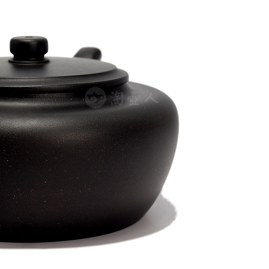 此件安和壶,采原矿底槽清为胎,全手工制作,并以捂灰工艺烧成,成器呈均匀的灰黑色,胎质中的砂粒如夜空点点繁星。壶体扁而端正,肩部挺括,近底微收,精神气足,不显扁塌。