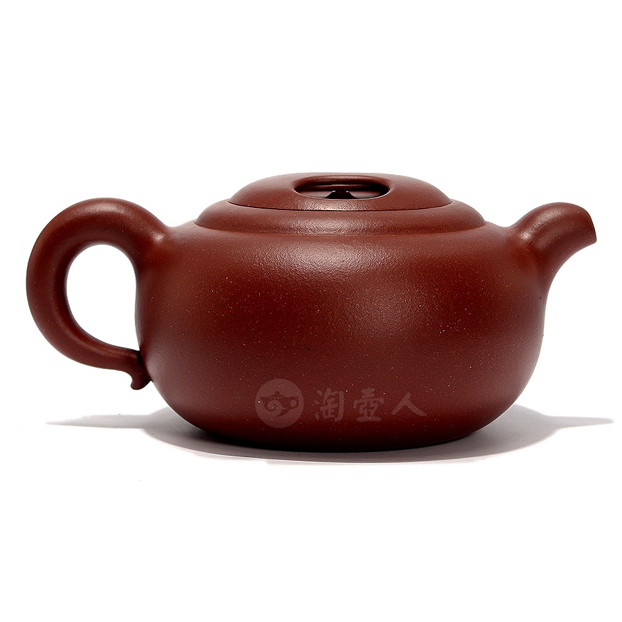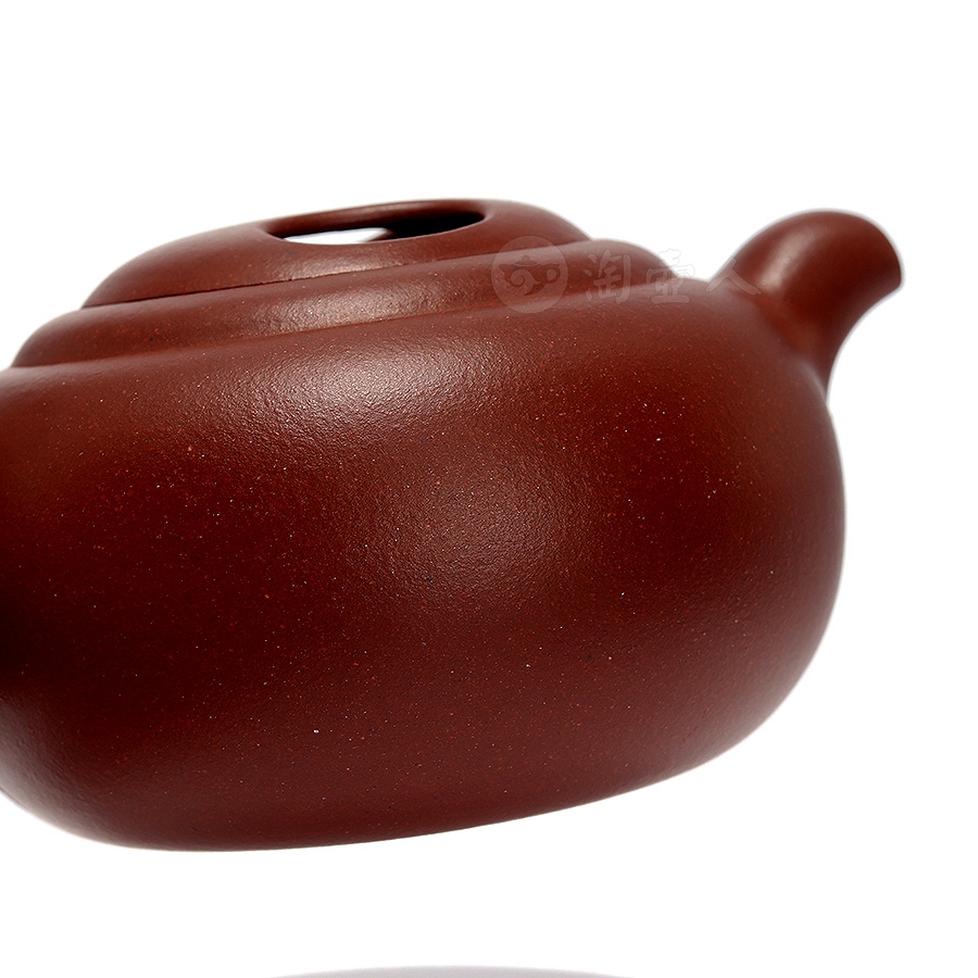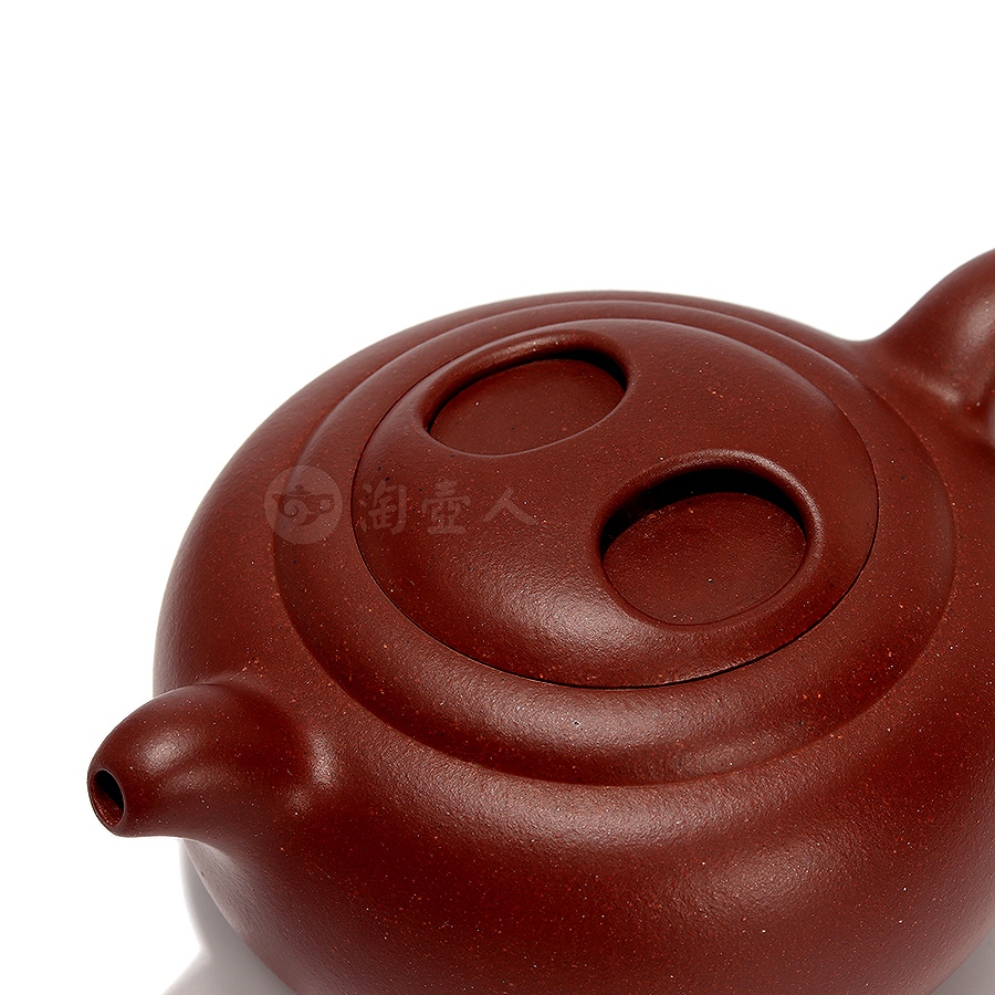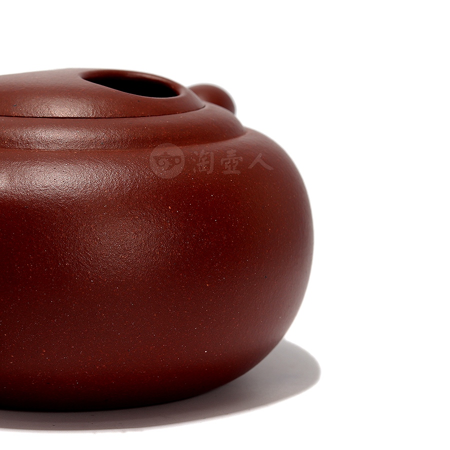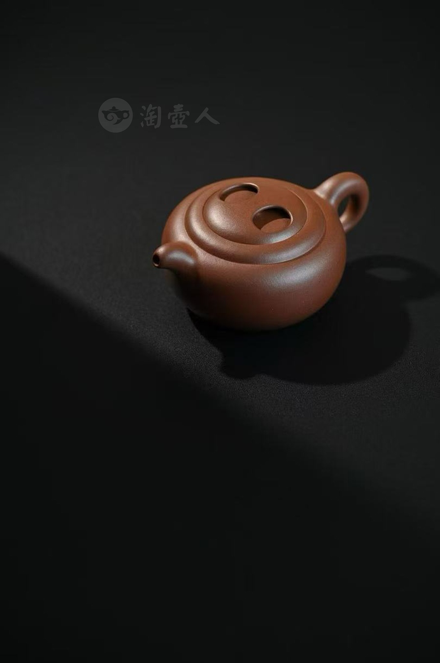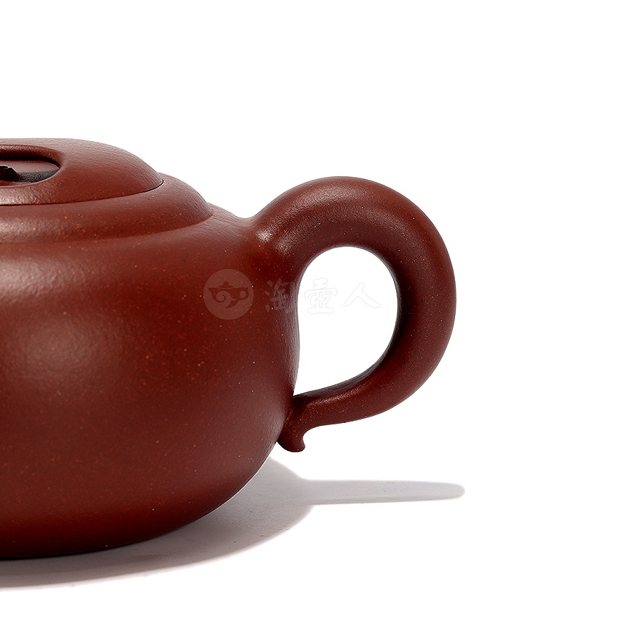 壶身如扁玉,线条饱满流畅,弧度柔和舒展,暗藏灵动气韵,圆盖嵌入壶口,工艺精准,宽带拱形钮犹如牛鼻,一弯流、带垂耳把自两侧自然胥出,对应协调,形成视觉上的平衡之美。整器比例拿捏恰到好处,壶身、壶盖、壶流、壶把浑然一体,无一处冗余,无一处欠缺,每一处细节都彰显着创作者的匠心巧思与深厚功底。