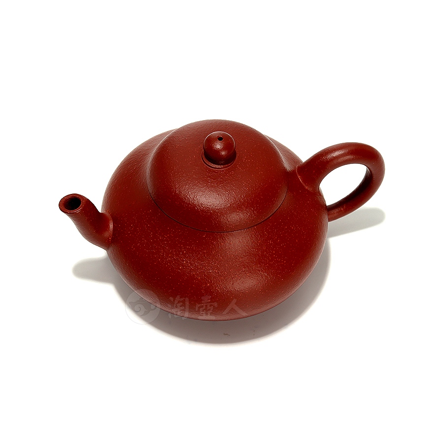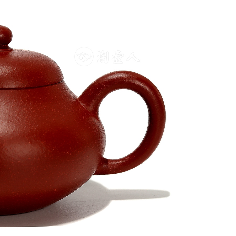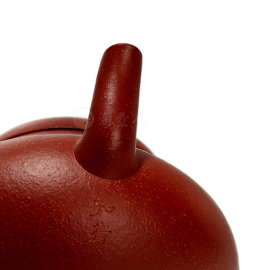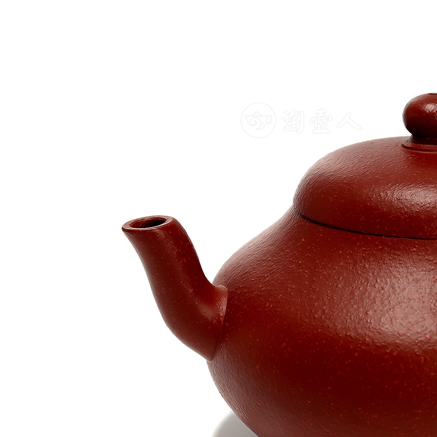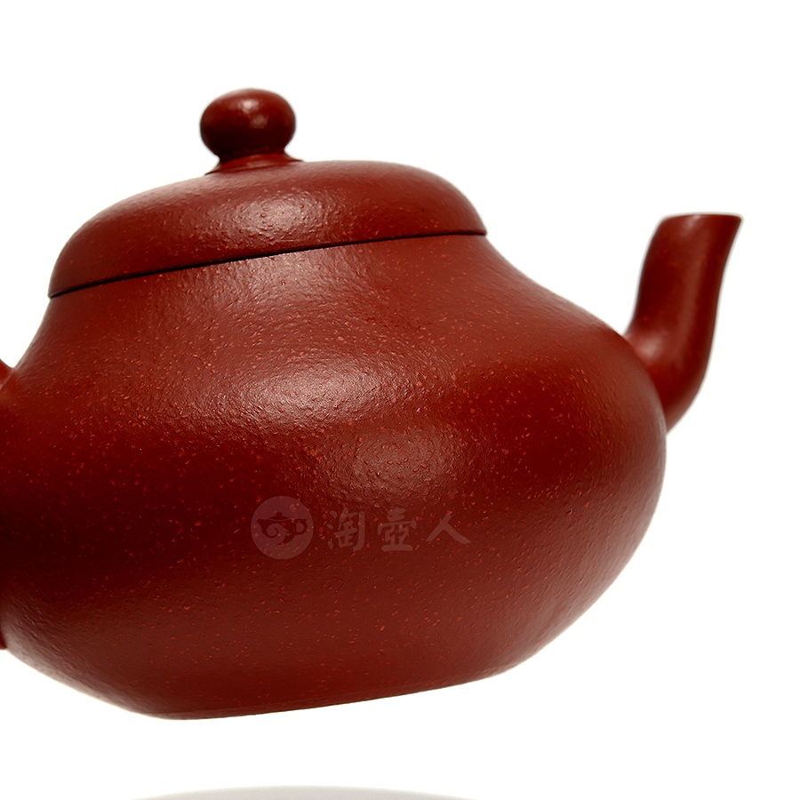 此件孟臣壶,甄选粗砂大红袍朱泥精心抟制,壶色红而不艳,通体砂感充沛,视觉效果相当丰富,泡养几次后渐生莹润包浆。壶型为矮梨式,鼓腹沉稳下坠,自壶腹向上至壶口缓缓收束,线条流转自然顺滑,整体造型圆润饱满,端庄雅致。