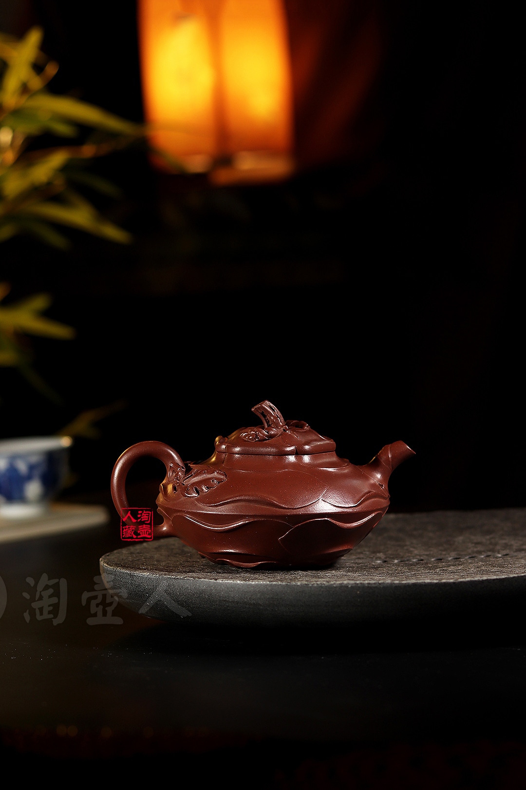 此件风卷葵壶,采原矿紫泥为胎,全手工精心抟制,以夸张却不失雅致的变形手法,将葵花硕大饱满的花托化为壶身主体,花瓣弧度自然收拢,形成合欢之形,将自然之美与紫砂工艺完美融合,堪称紫砂花货中的上乘之作。