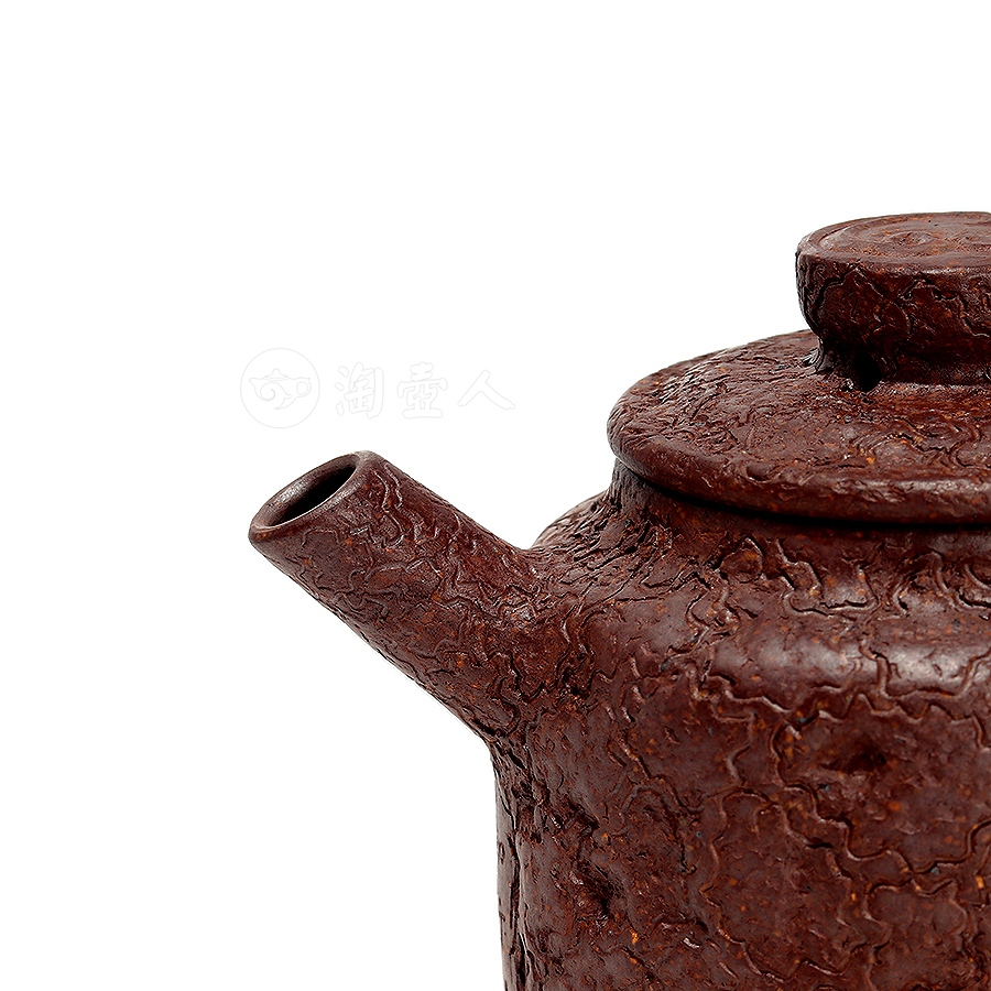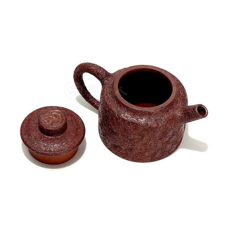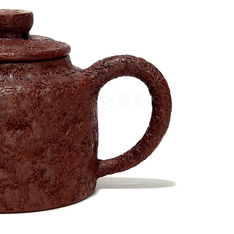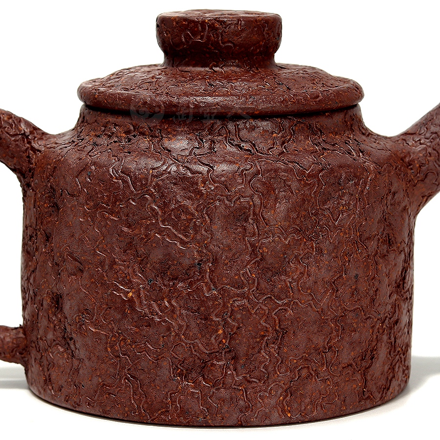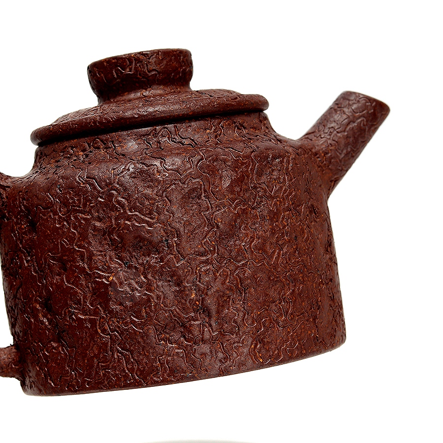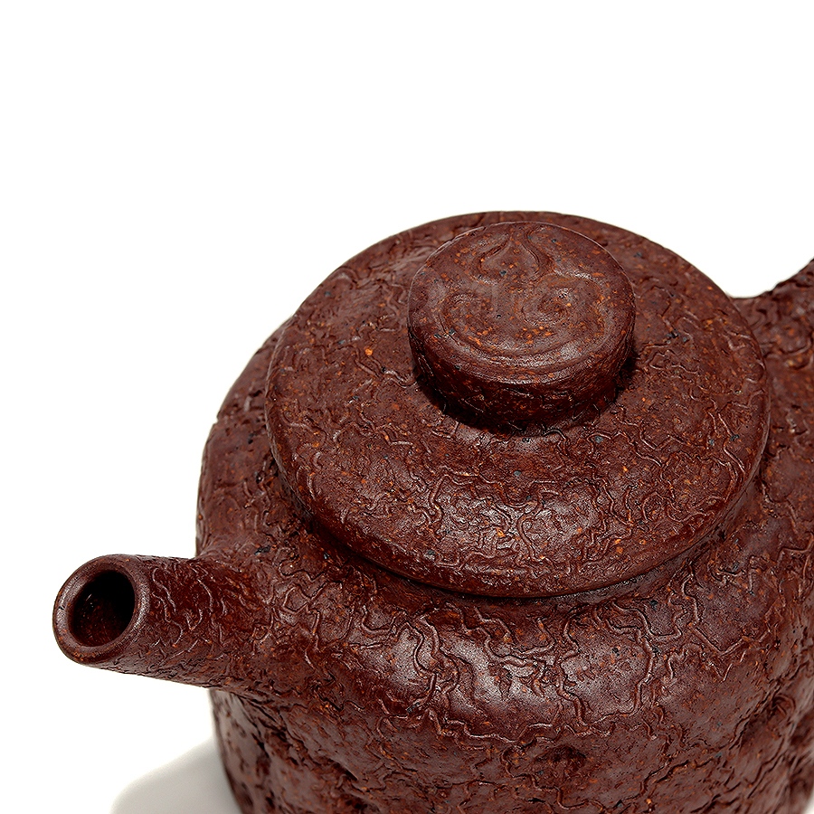此件福泉壶,乃作者原创设计,萃取传统巨轮珠壶型精髓,突破经典桎梏,通体塑出供春肌理,每一处凹凸褶皱皆如古树瘿纹自然生长,繁而有序、别致耐看。甄选优质原矿紫泥,以全手工薄胎技法精修细作,薄而不脆,彰显匠人功底,采用高温松木柴烧工艺,松油在窑火中自然蒸发浸润壶身,搭配缓慢受热产生的水汽交融,让壶表形成天然油润光泽,窑变肌理独一无二。