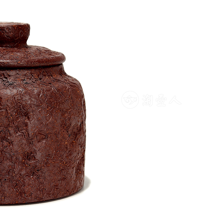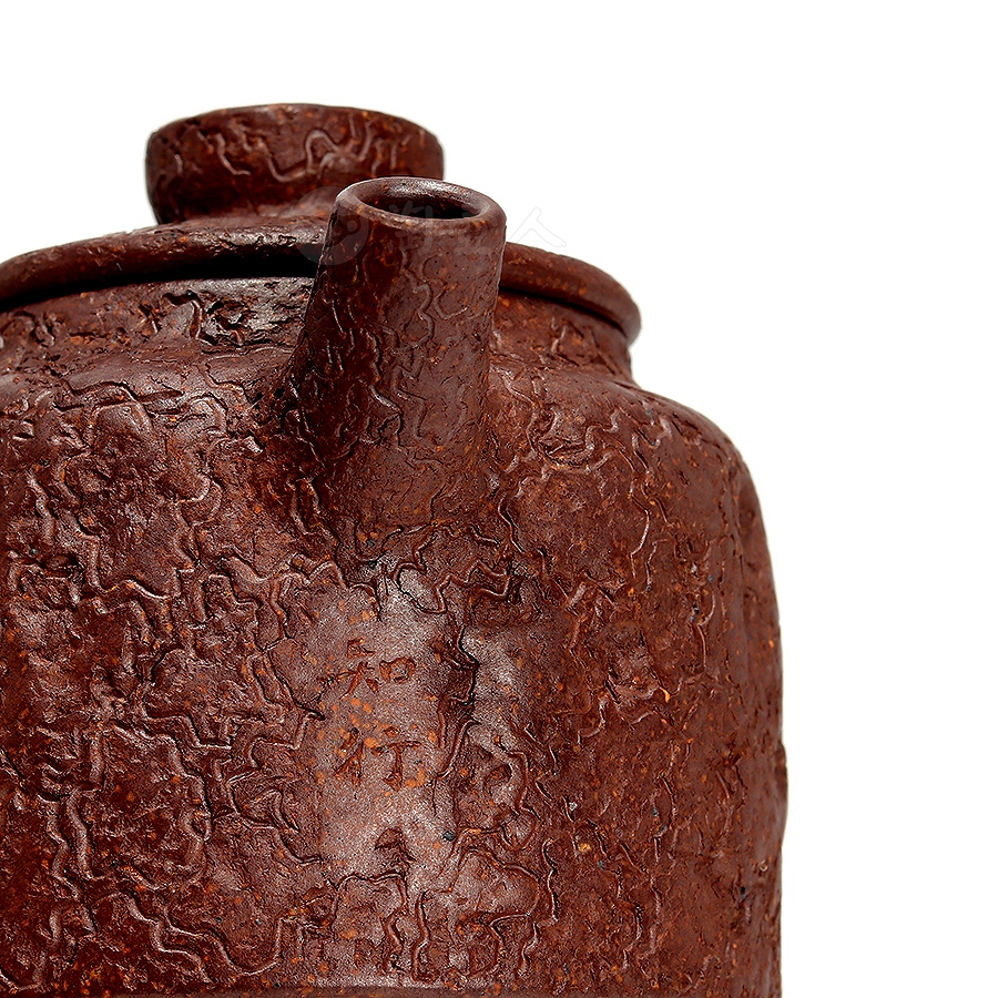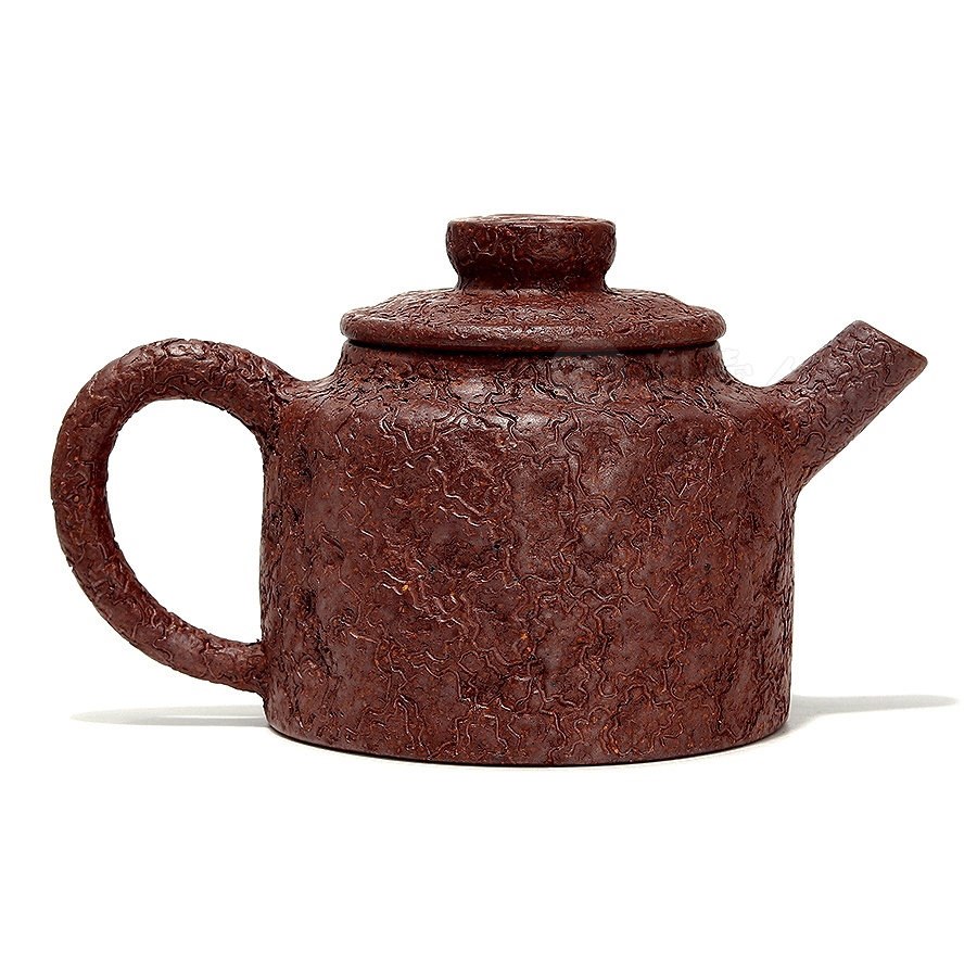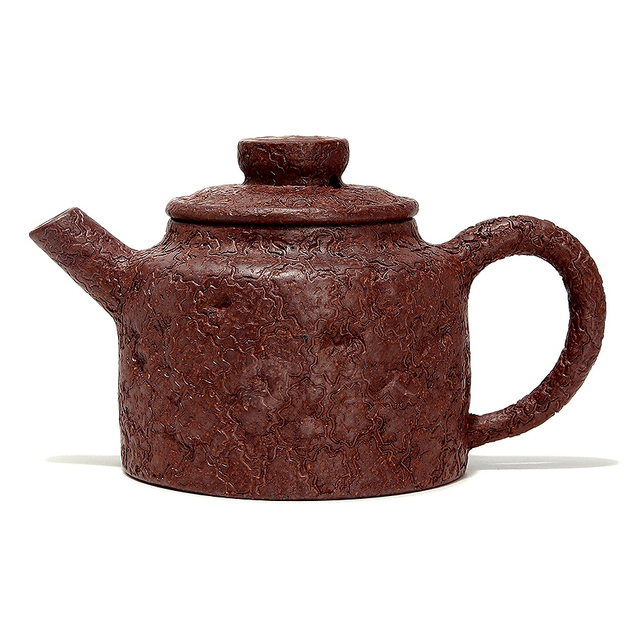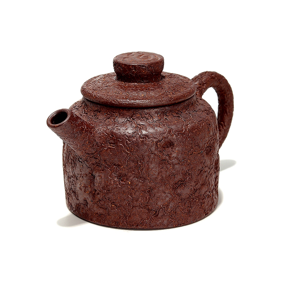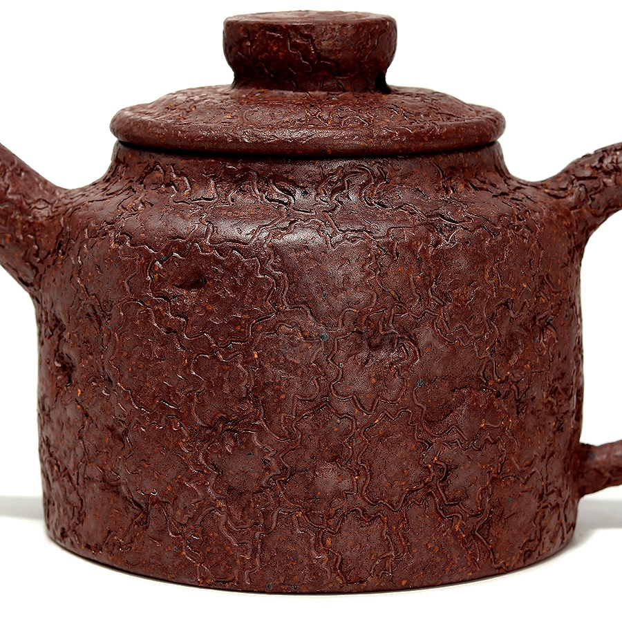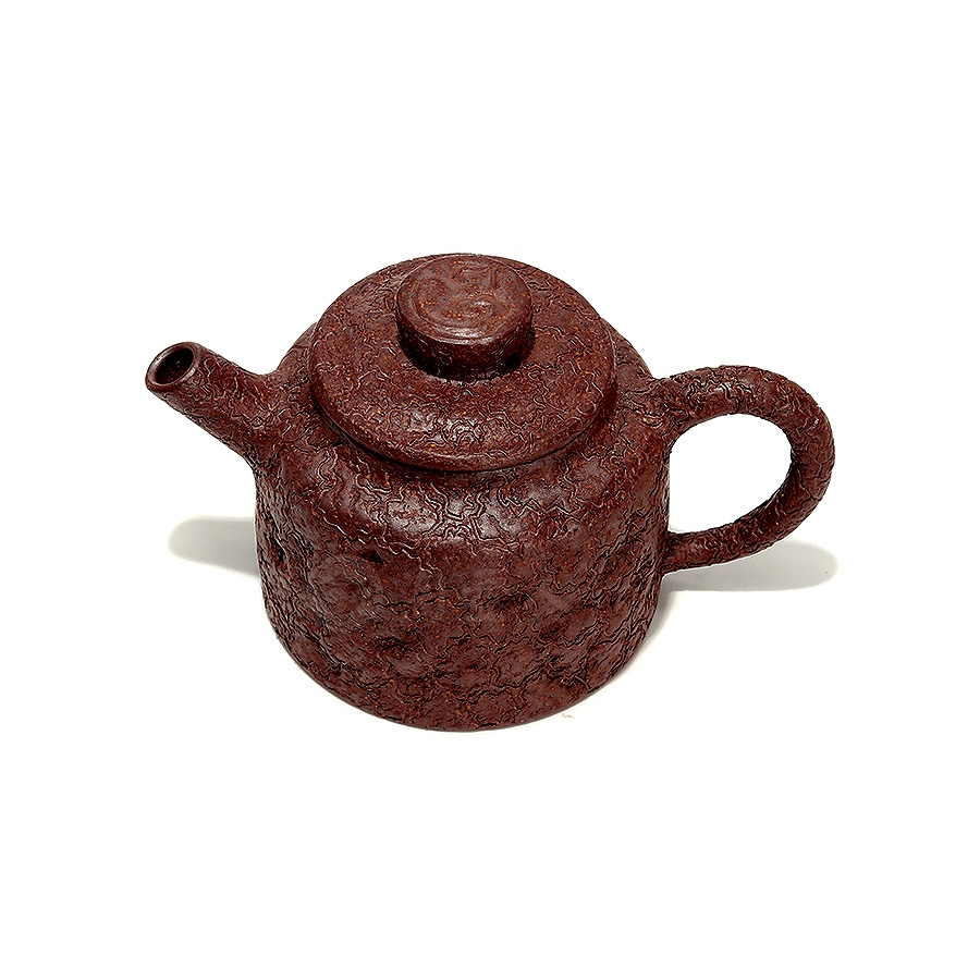 此件福泉壶,乃作者原创设计,萃取传统巨轮珠壶型精髓,突破经典桎梏,通体塑出供春肌理,每一处凹凸褶皱皆如古树瘿纹自然生长,繁而有序、别致耐看。甄选优质原矿紫泥,以全手工薄胎技法精修细作,薄而不脆,彰显匠人功底,采用高温松木柴烧工艺,松油在窑火中自然蒸发浸润壶身,搭配缓慢受热产生的水汽交融,让壶表形成天然油润光泽,窑变肌理独一无二。
