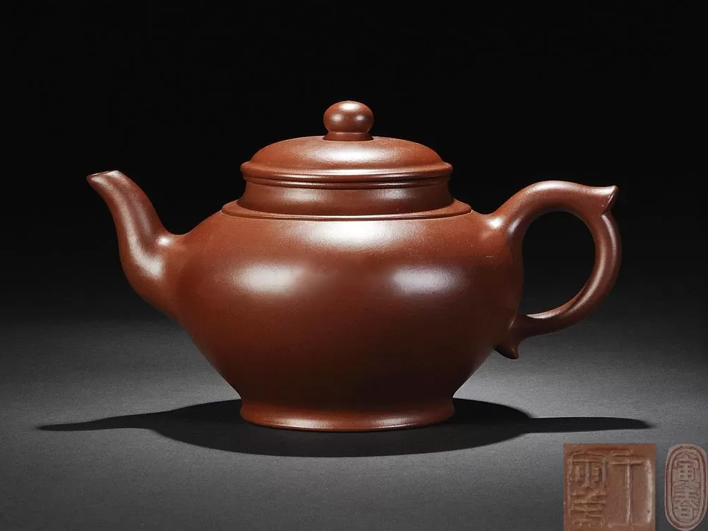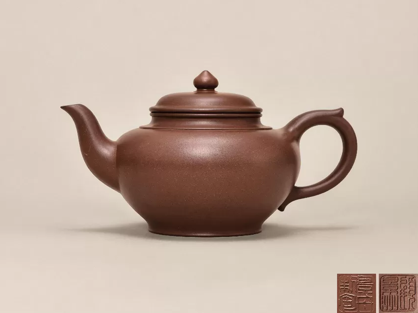 顾景舟的笑樱壶采用天然纯紫泥制成,泥质细腻不腻,色泽紫而不艳,温润腴丽;壶身微扁圆,折腹隆肩,形体雄健,线条流畅,尽显丰满柔和之美,是紫砂光素器的珍品典范。