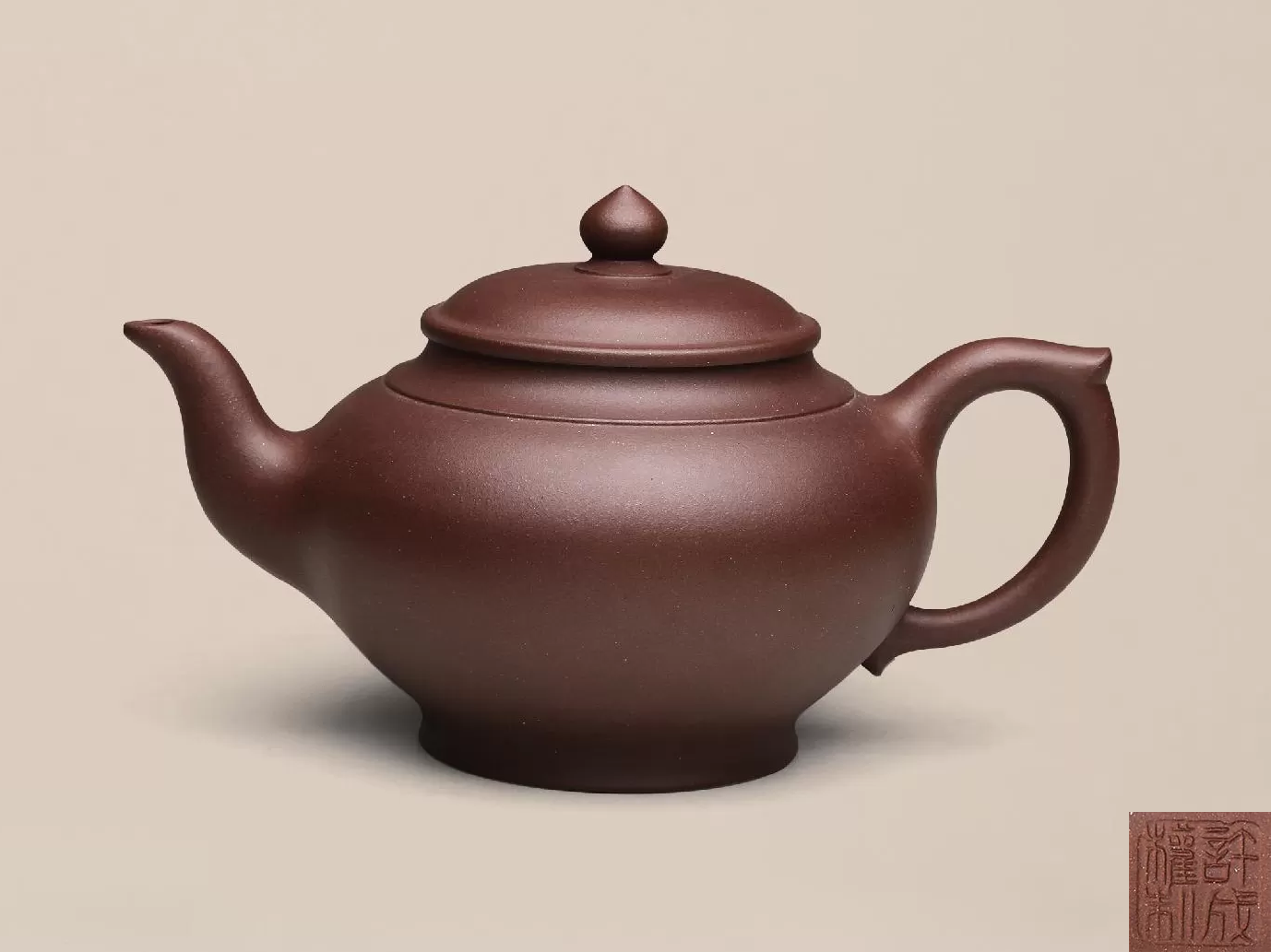 设计者从罂罐圆润的曲线中提炼出富于变化的线条,系统构思成壶,最终成为紫砂光素器中的经典之作。
