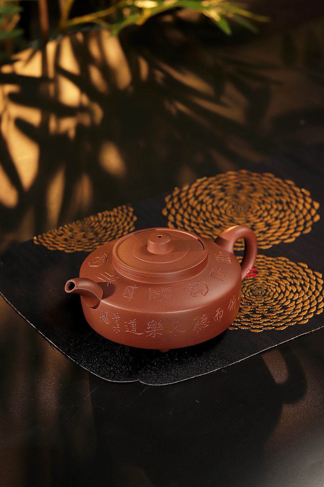 壶型承袭曼生周盘精髓,以罗盘为原型,暗合“曲直合一”的处世之道,身桶扁圆饱满,壶底三足鼎立,稳重大气又不失灵动,圆润弧度中暗藏刚劲风骨。