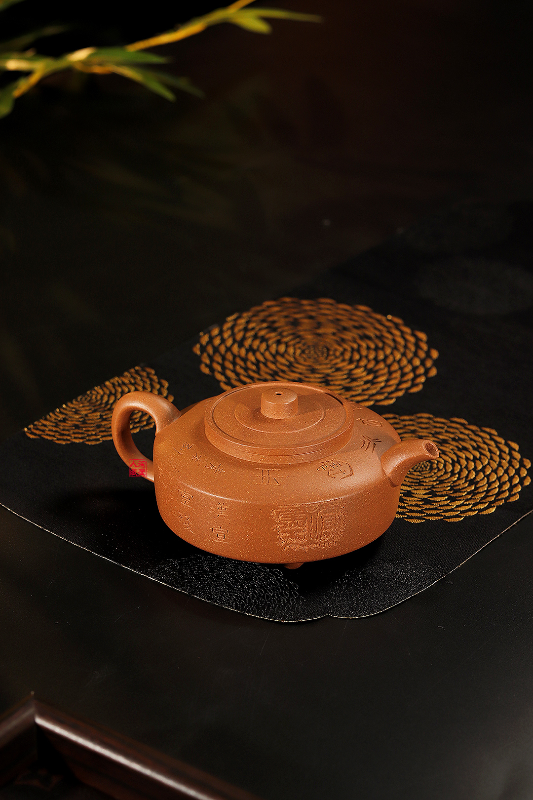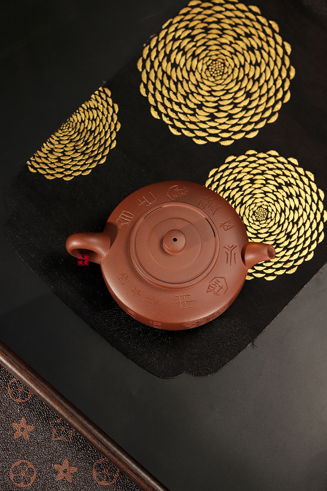 特邀陶刻名家张曦书铭,壶身正面刻“望山俯而听泉”,反面绘“宣灵”瓦当纹样,旁注“汉宣灵残瓦”,壶肩环刻“自作宝盘其永宝用”,自带古器雅韵,让实用茶具更添厚重历史人文气息。