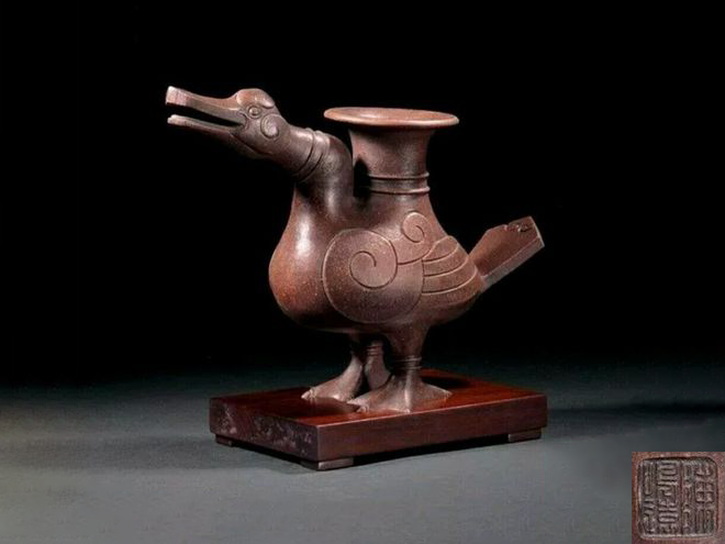 天鹅樽的器形最早见于《宣和博古图》卷七,顾景舟仿作既延续了原作古朴端庄的气质,又保留了灵动自然的韵味,线条简洁流畅,刻画细腻入微。
