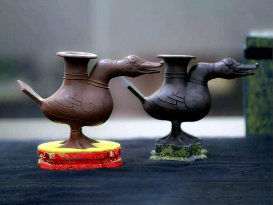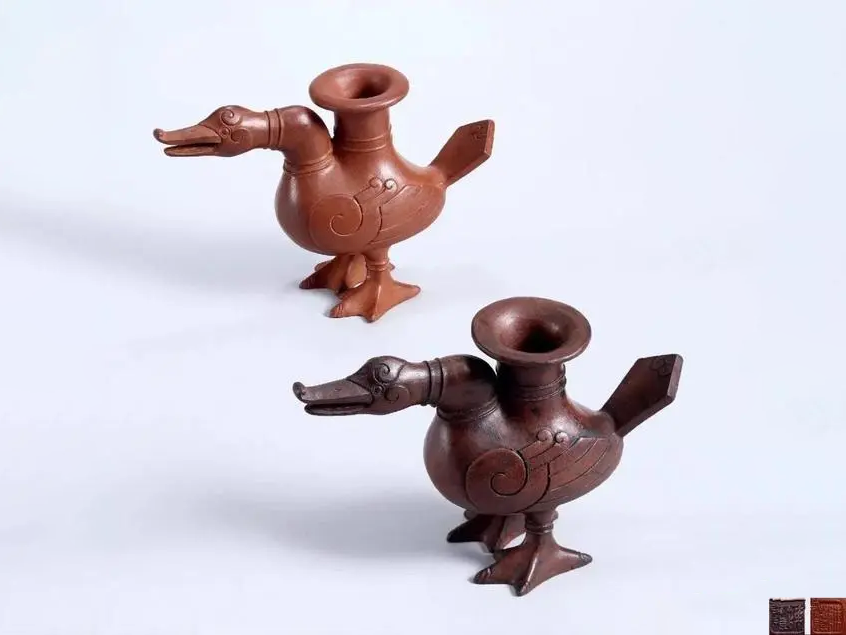 此器形制源自古代青铜器,整体以樽为基础造型,巧妙将樽腹与器足演化成鸭的形态,宛如天鹅背负一樽,故而得名“天鹅樽”,与凤樽同属一类经典器型。