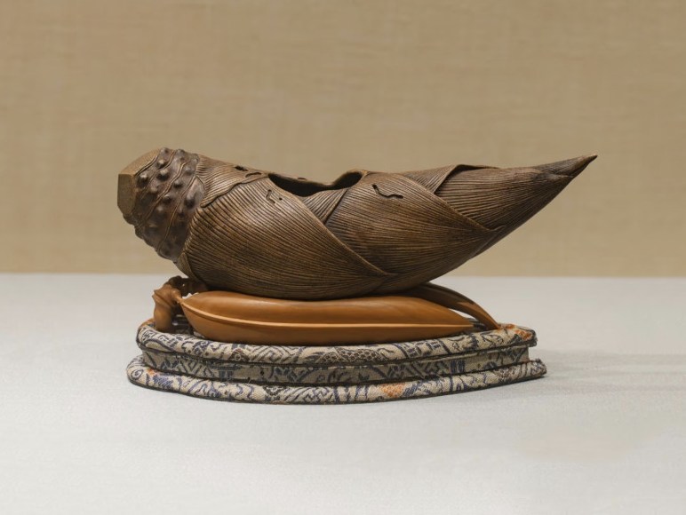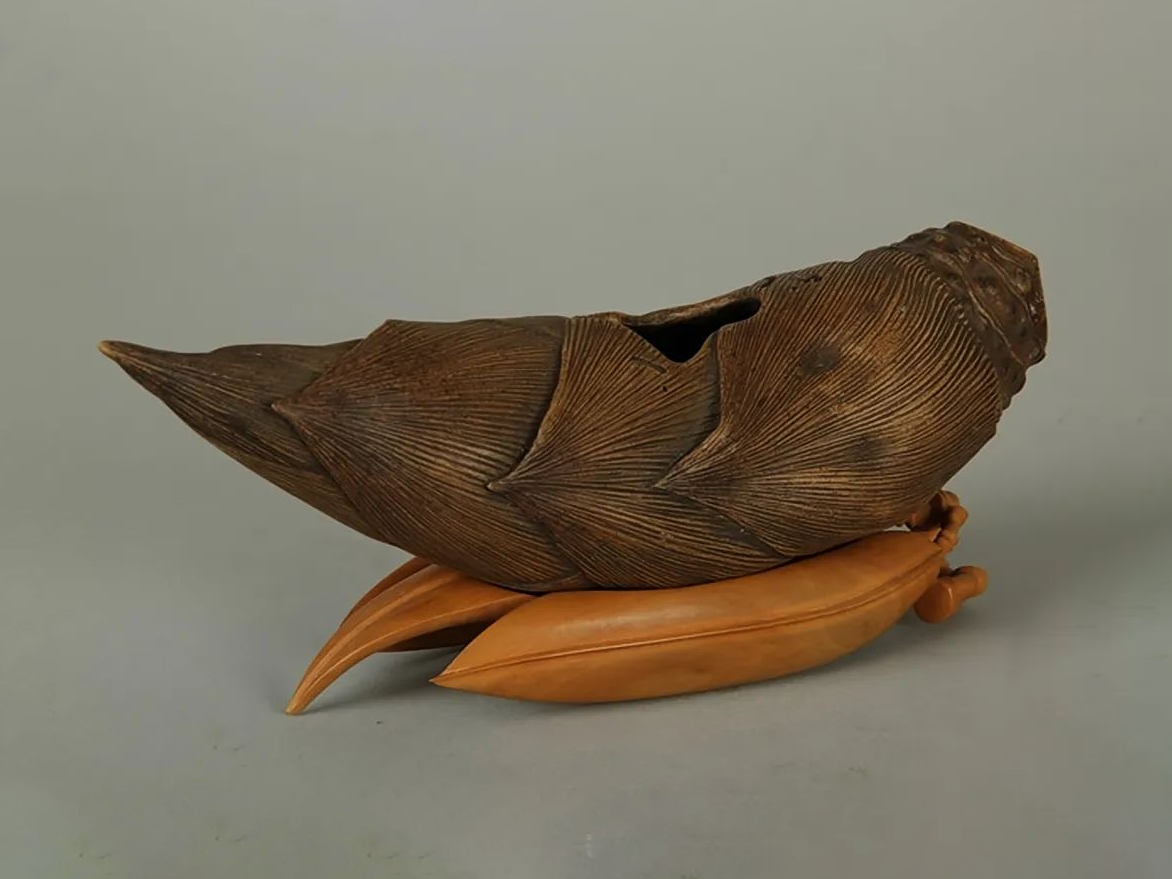 器身六片笋壳层层相叠,细密的筋脉清晰可辨,根部的笋痣刻画得栩栩如生,自然形成的虫蛀痕迹逼真自然,同时兼顾实用功能,口注设计合理,堪称巧夺天工的紫砂珍品。