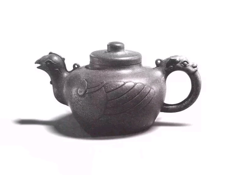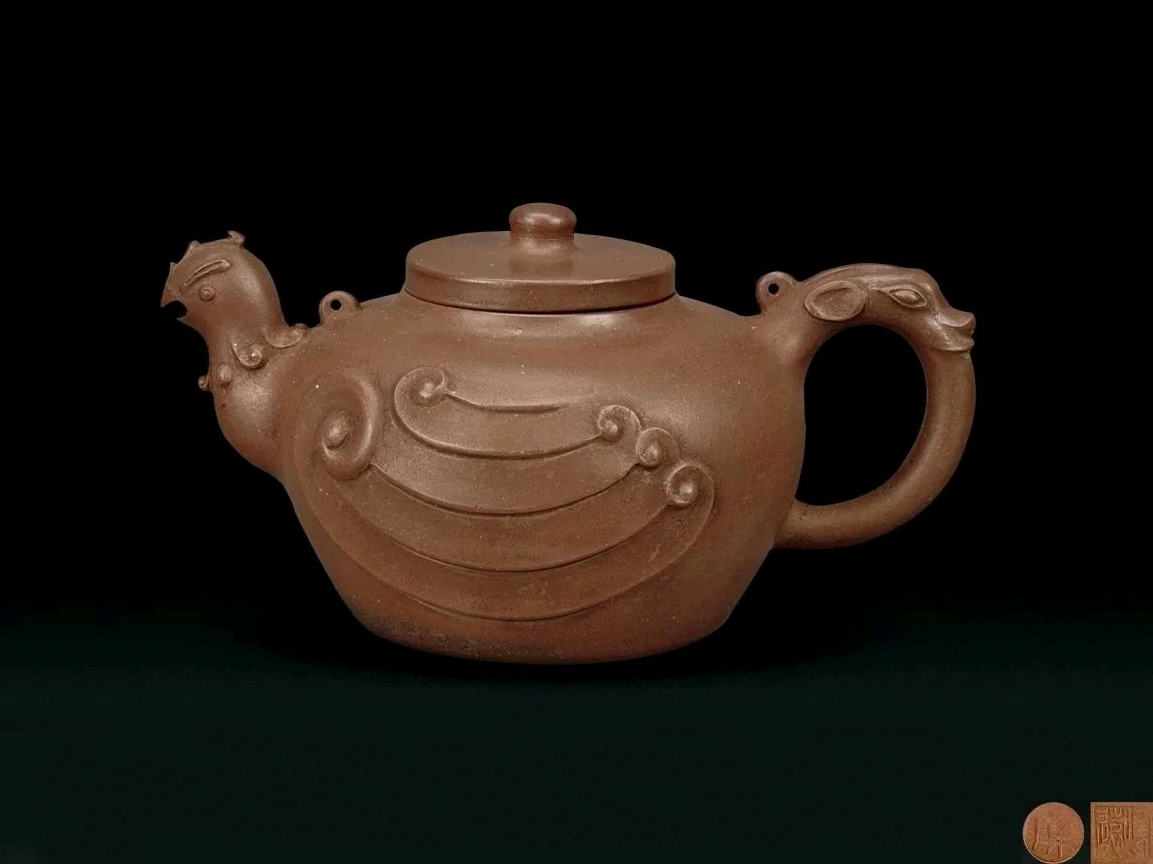 顾景舟凭借敏锐的观察力与精湛的技艺,成功还原出龙把凤嘴壶的精髓,泥色红赭似古铜,掺砂点点,造型生动,寓有龙凤呈祥之意。