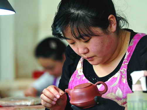 喀左县一家紫砂企业手工艺人正在制作紫砂壶。