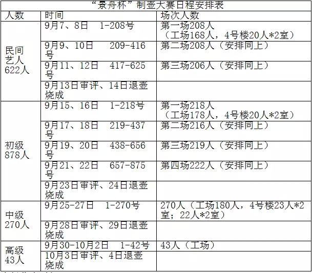 目前,宜兴市景舟杯手工制壶大赛日程初步确定,大赛从9月7日开始,至10月4日结束,本次大赛参赛人员共1813人,分四组进行,依次为民间类、初级职称类、中级职称类及高工、研高类。民间类、初级类每场2天,工艺师以上每场3天。民间组622人,分三场进行,前后6天;初级类878人,分四场进行,前后8天;中级类一场,270人,前后三天;高工、研高类一场(43人),前后三天。