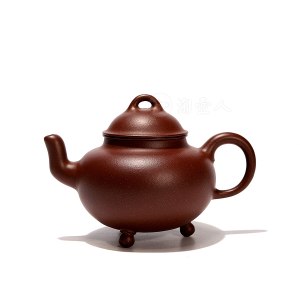 陈瀚柽此件全手精工《三足桥鼎》紫砂壶,150CC造型精巧。壶身圆融饱满,气韵充沛,线条流畅,肩颈柔和。口盖吻合严密,压盖高鼓,上立桥钮,足作三球,趣味颇丰。弯流自腰腹胥出,遒劲蕴力,耳把纤巧秀雅,持握称手。通体光素无纹,古意浓厚,乃上手把玩之利器。