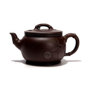 紫砂顾问:叶蕾 收藏热线:18501671666 谭泉海此件百禧图壶,为谭泉海大师创作于1990年(庚午年)冬月,采一厂老紫泥为胎抟制,造型仿若酒壶,壶身正面陶刻《百喜图》,反面则刻童子送喜图案。