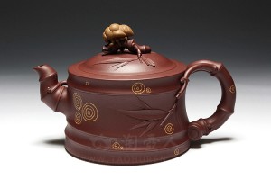 《知竹》壶,壶式造型奇巧,壶身仿天然竹之不规则形,壶体绞泥螺纹装饰,错落有致,极为雅致美观。流把钮为竹节弯折而成,贴花立体而生动。最为精巧之处在于竹节壶钮上趴伏这一只几可乱真的蝉猴,令人感叹钱丽媛老师工艺精湛、心思细腻!