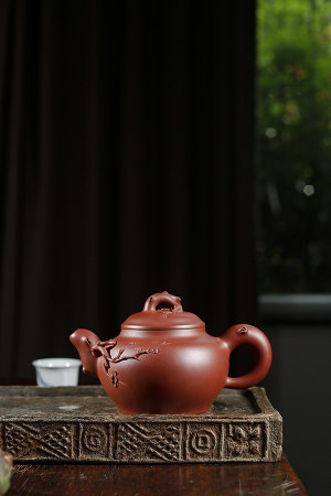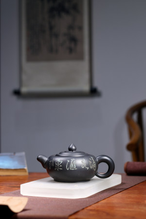 高湘君《一粒珠壶(李兆濂书铭)》是一种传统壶式,相传是明天启、崇祯间制作紫砂壶名家惠孟臣所创,此壶摹古而作。整体器身呈宝珠状,身由李兆濂刻绘装饰,正面陶刻“诗写梅花月,茶煎谷雨春”……