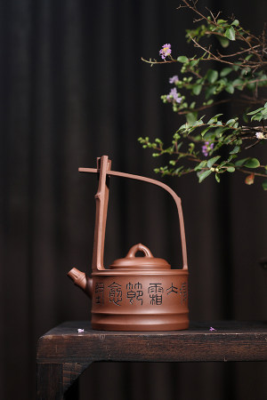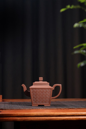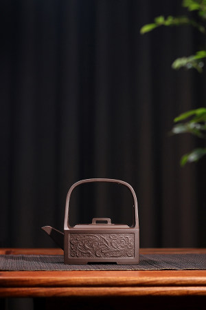 孔小明《唐草提梁壶》以食盒为基型,用唐草纹装饰壶身,采用原一厂老紫泥制成。壶身四方,面面俱到,下延伸四方脚,沉稳内敛。带状提梁把线条过度自然,曲合有度,以镂空纹装饰……