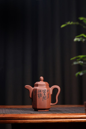 孔小明《鱼水情壶(薄胎)》采用了原矿老紫泥制作而成,壶容量为380cc,壶身呈六方碗型,整体线条呈现上密下疏,这种六方壶体款式的壶由泥片衔接,而此种方法的制作难度大